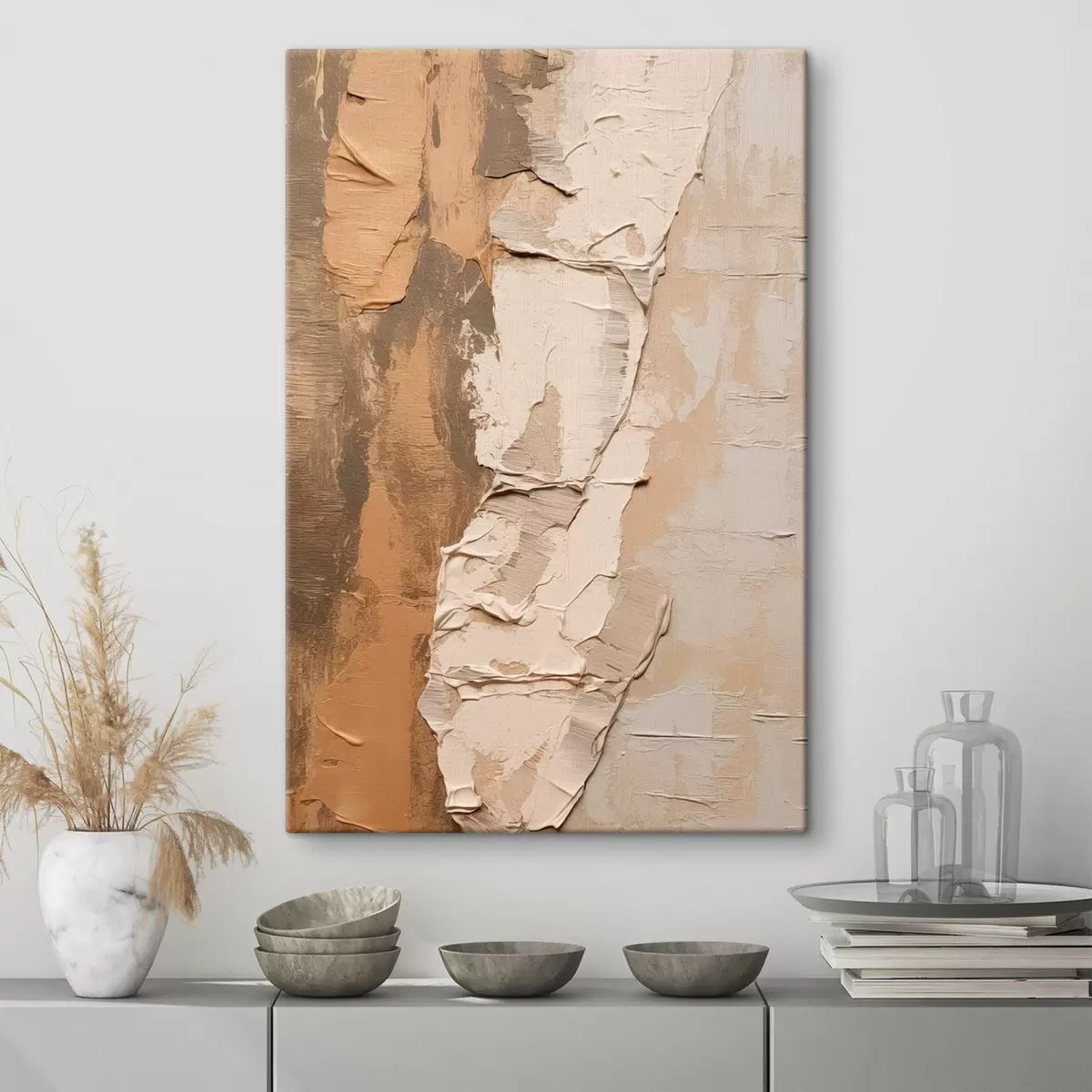 Obraz Malarstwo abstrakcyjne z grubymi pociągnięciami pędzla, beżowymi i brązowymi odcieniami, teksturowaną powierzchnią, neutralną paletą kolorów Nr s46272