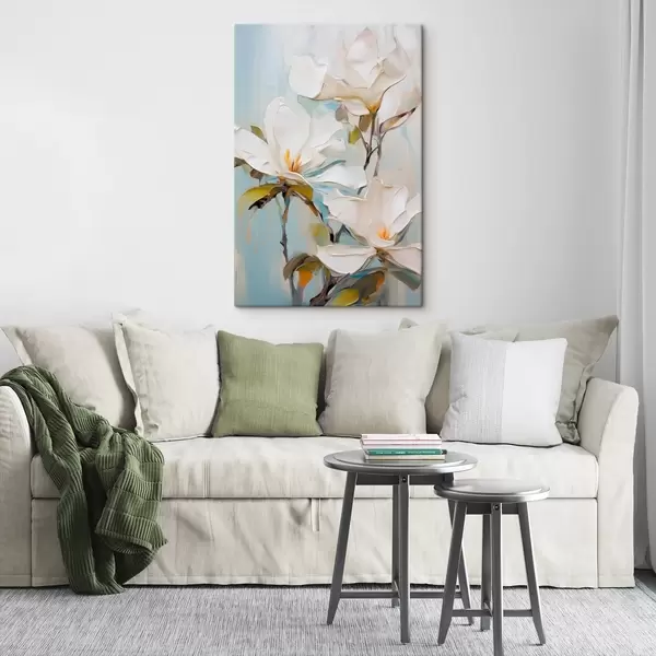 Obraz Białe kwiaty magnolii, jasnoniebieskie tło z delikatnymi pociągnięciami pędzla, styl malarstwa olejnego, faktura impasto s46276