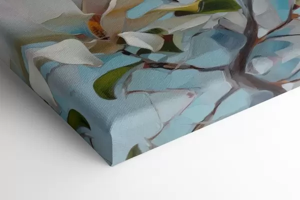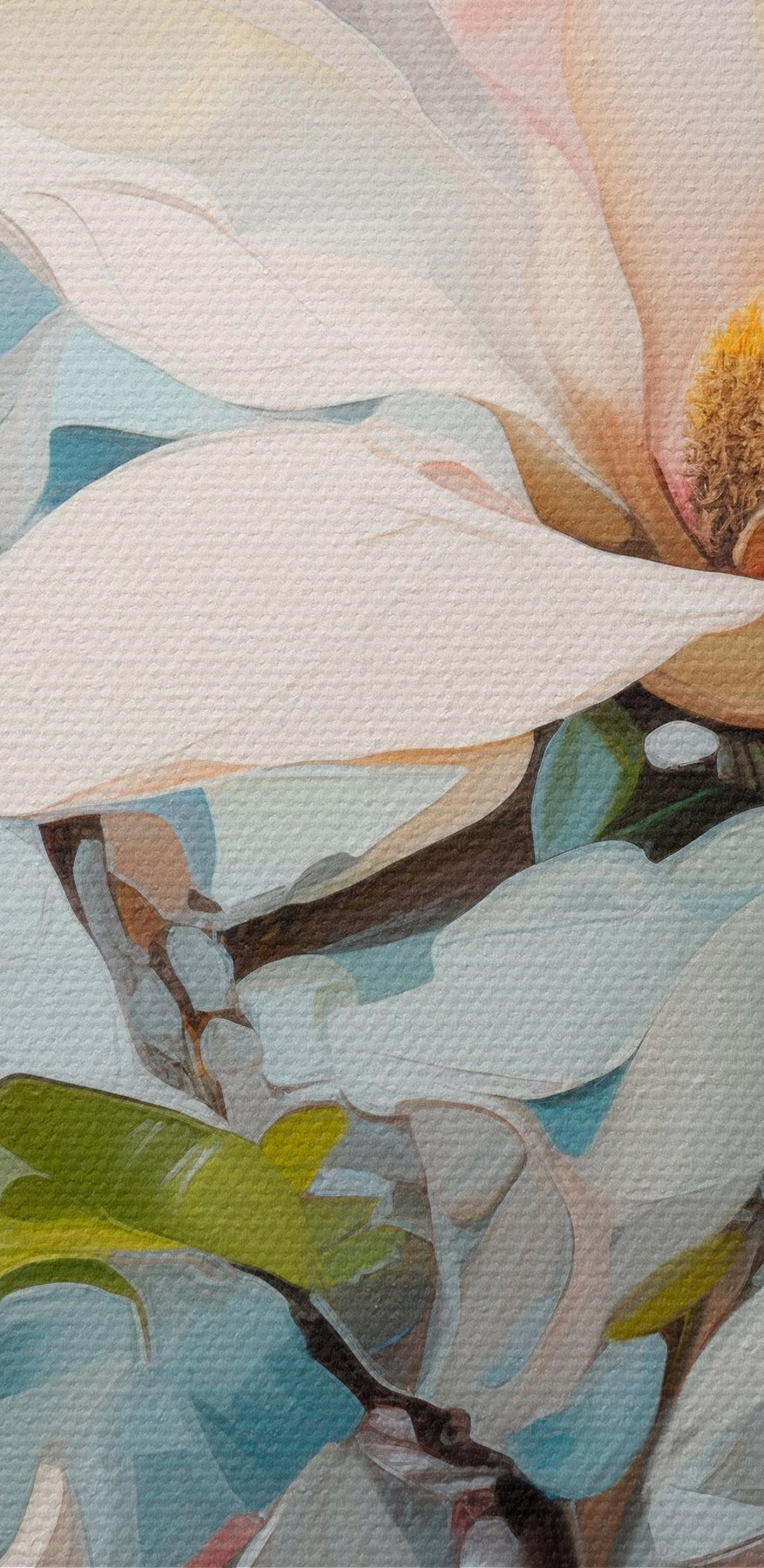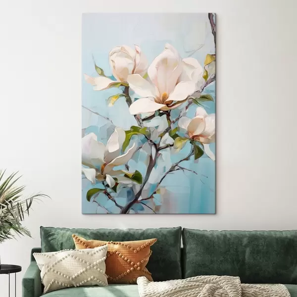 Obraz Białe kwiaty magnolii, jasnoniebieskie tło z delikatnymi pociągnięciami pędzla, styl malarstwa olejnego, faktura impasto s46277