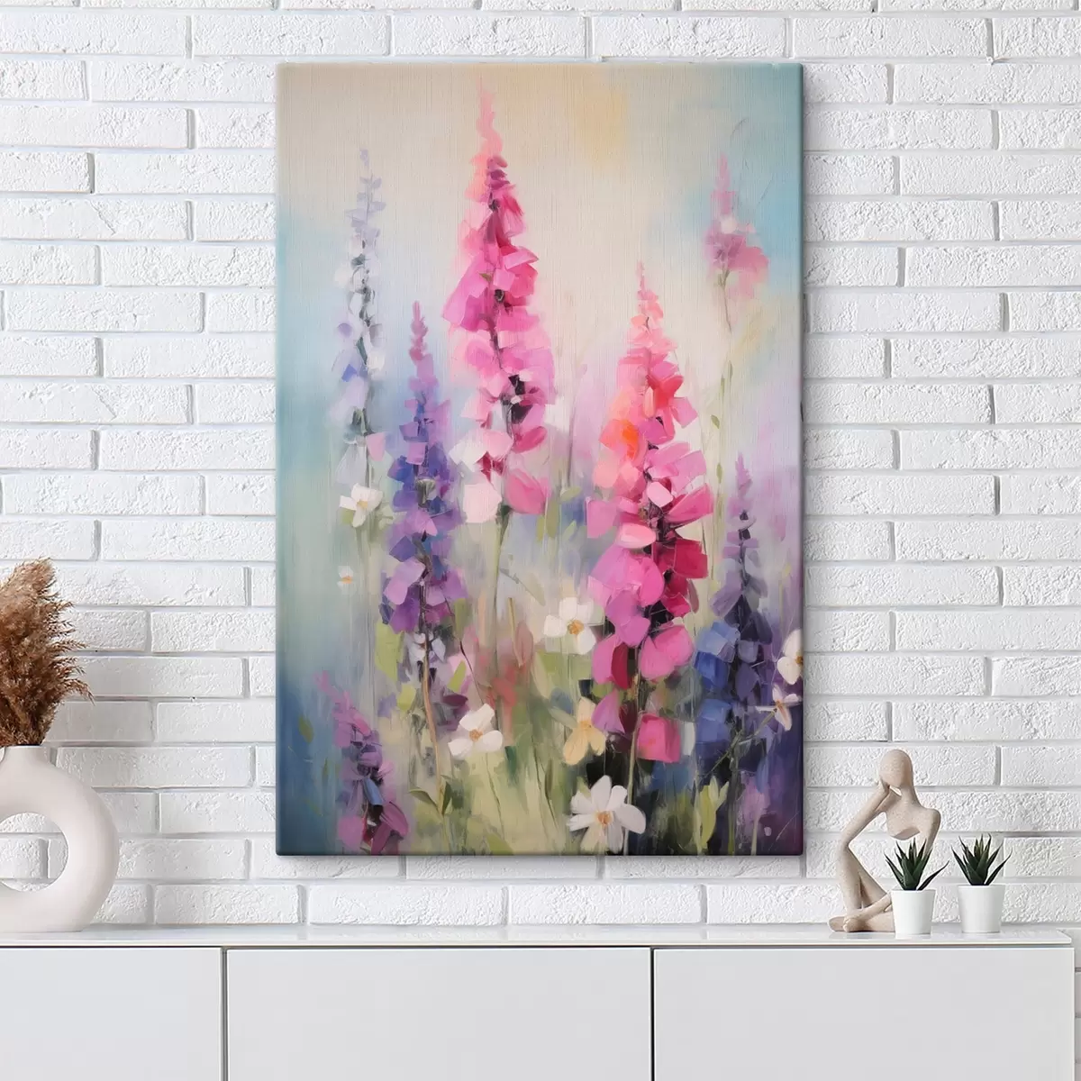 Obraz Różowe i fioletowe kwiaty z białymi stokrotkami na polu, delikatne pociągnięcia pędzla, pastelowe kolory, styl impresjonistyczny s46279
