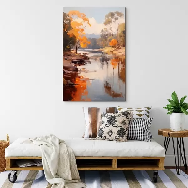 Obraz Jesienny krajobraz, rzeka z drzewami na brzegu, las w tle, odbicia na wodzie s46280
