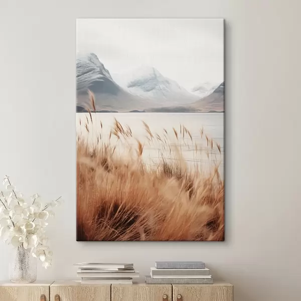 Obraz Pole trawy pampasowej przed jeziorem, w tle ośnieżone góry, miękkie światło s46282