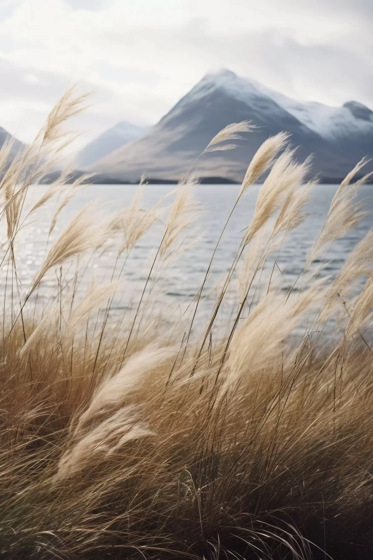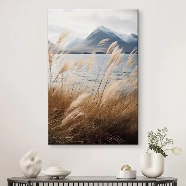 Obraz Trawa pampasowa z jeziorem i górami w tle, delikatne oświetlenie, stonowane kolory, styl naturalistyczny Nr s46283