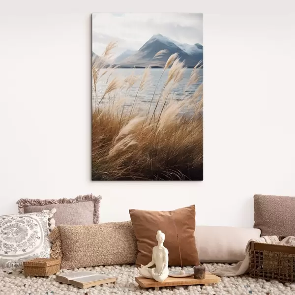 Obraz Trawa pampasowa z jeziorem i górami w tle, delikatne oświetlenie, stonowane kolory, styl naturalistyczny s46283