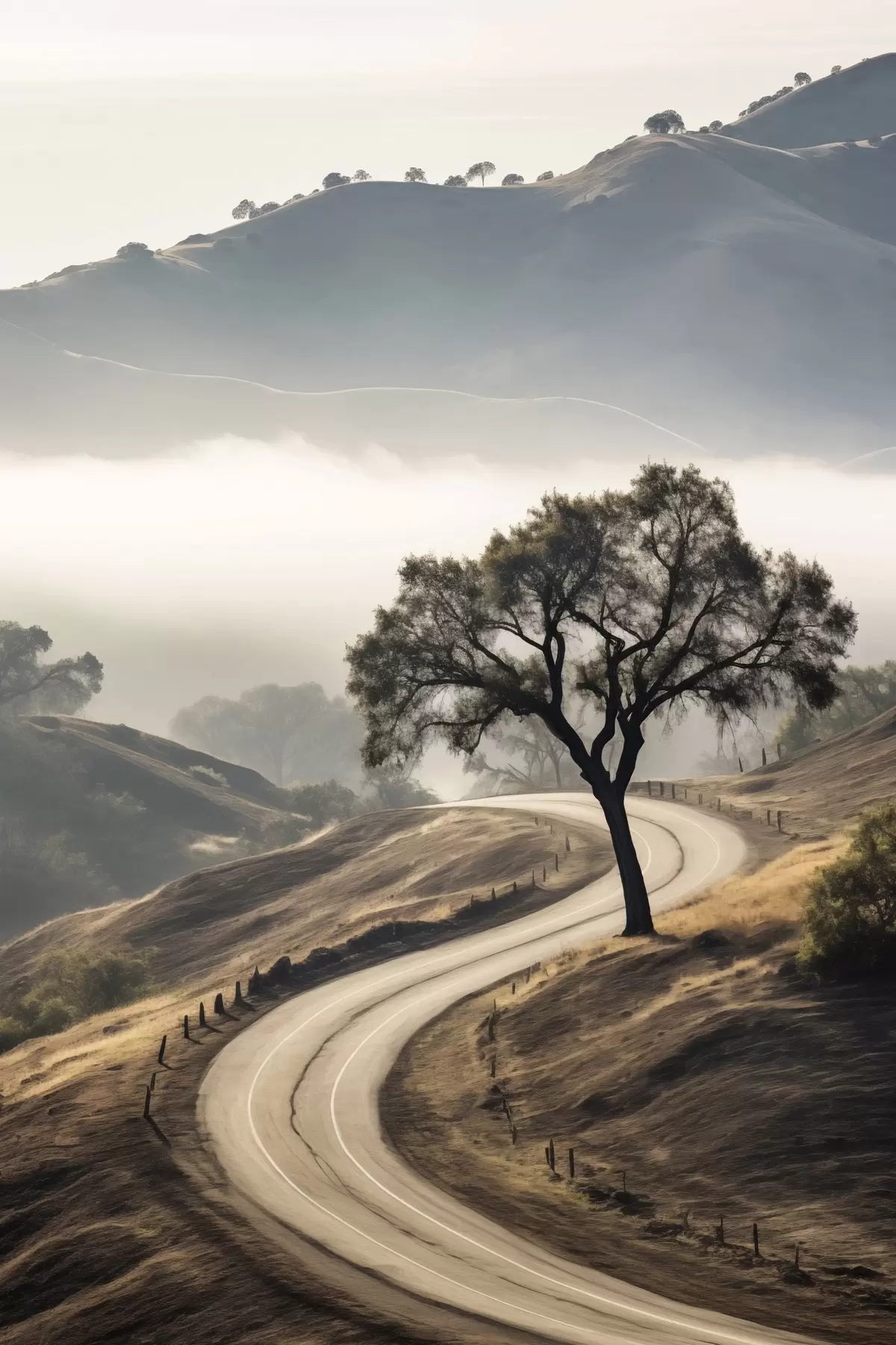 Obraz Kręta droga wśród falistych wzgórz z drzewem na pierwszym planie, w tle mgła i góry Nr s46288
