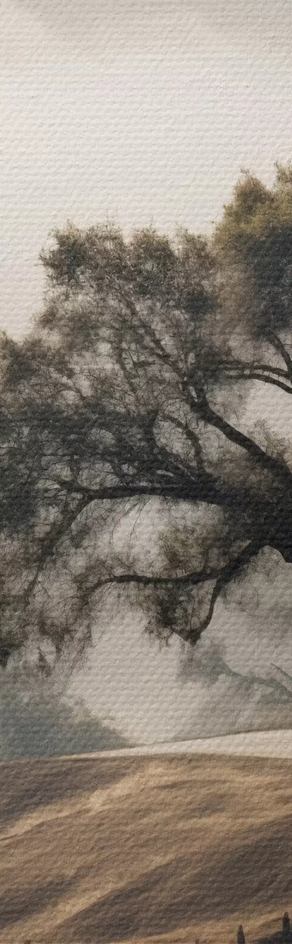 Obraz Kręta droga wśród falistych wzgórz z drzewem na pierwszym planie, w tle mgła i góry s46288