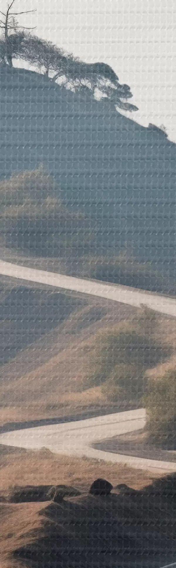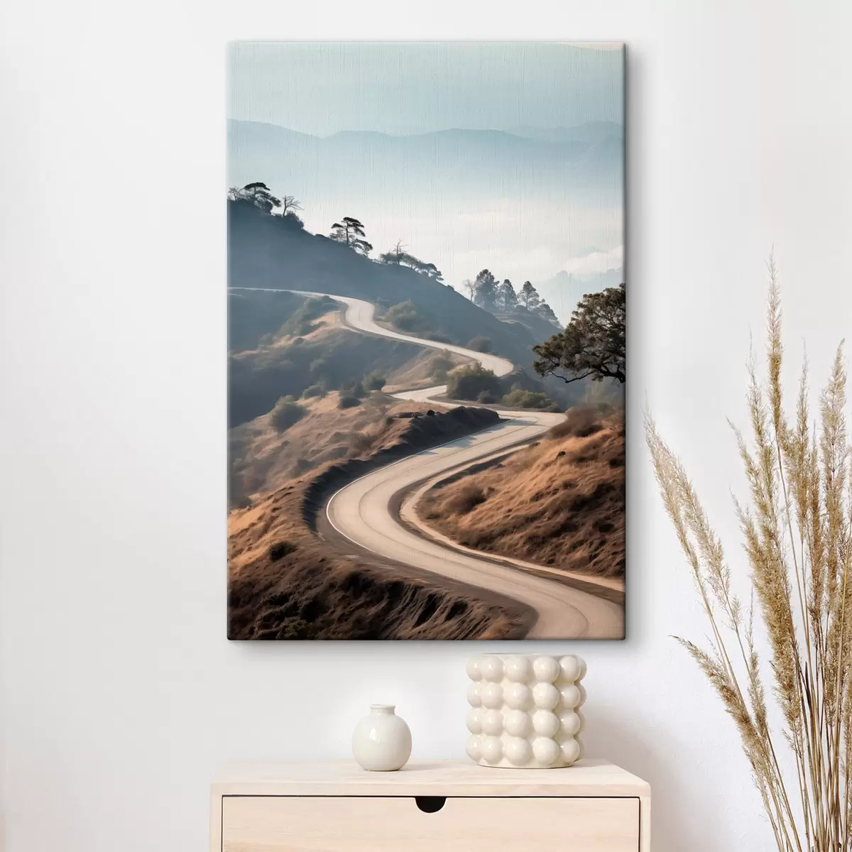 Obraz Kręta droga przez pagórkowaty krajobraz z suchą trawą pod czystym niebem, z górami w oddali Nr s46289