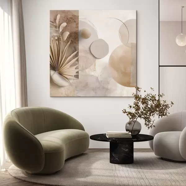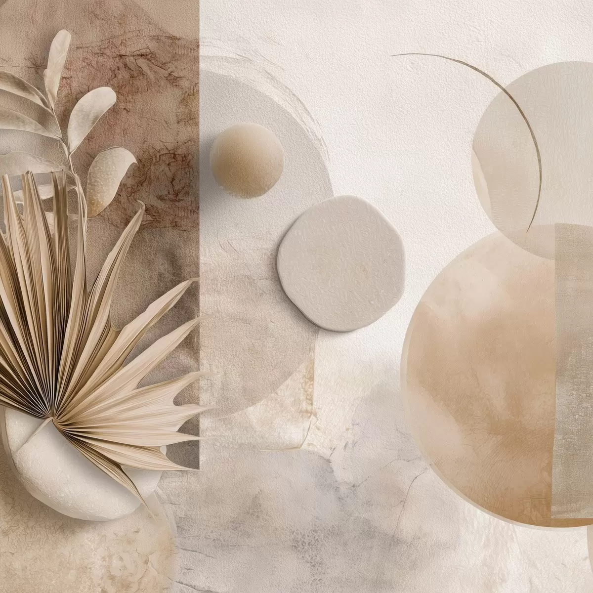 Obraz Suszone liście palmowe i trójwymiarowe koła w odcieniach beżu Nr s46310