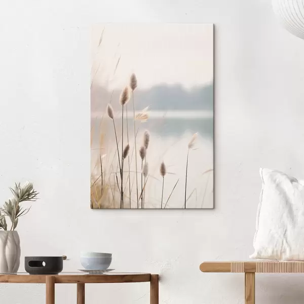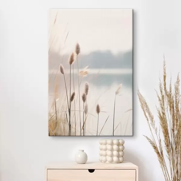 Obraz Miękkie trzciny nad mglistym brzegiem jeziora, pastelowe odcienie beżu Nr s46504