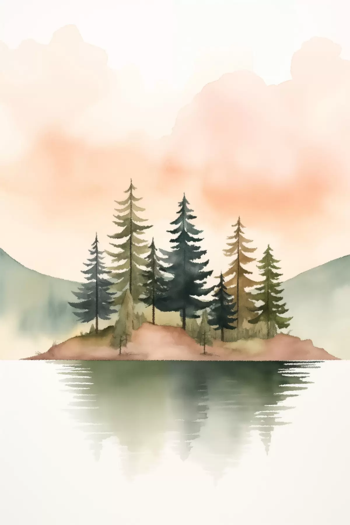 Obraz Akwarelowe sosny na zamglonej wysepce, delikatne brzoskwiniowe niebo s46505