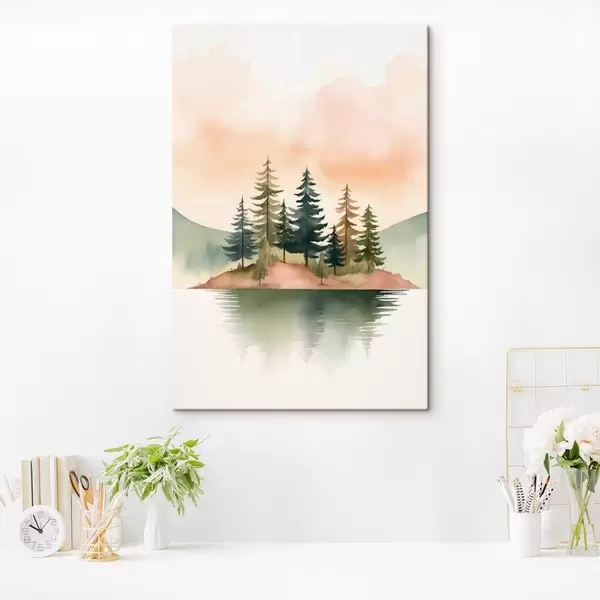 Obraz Akwarelowe sosny na zamglonej wysepce, delikatne brzoskwiniowe niebo Nr s46505
