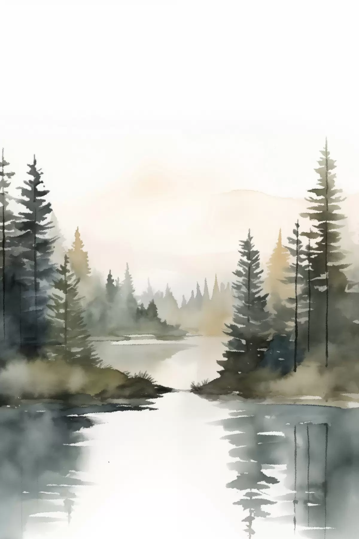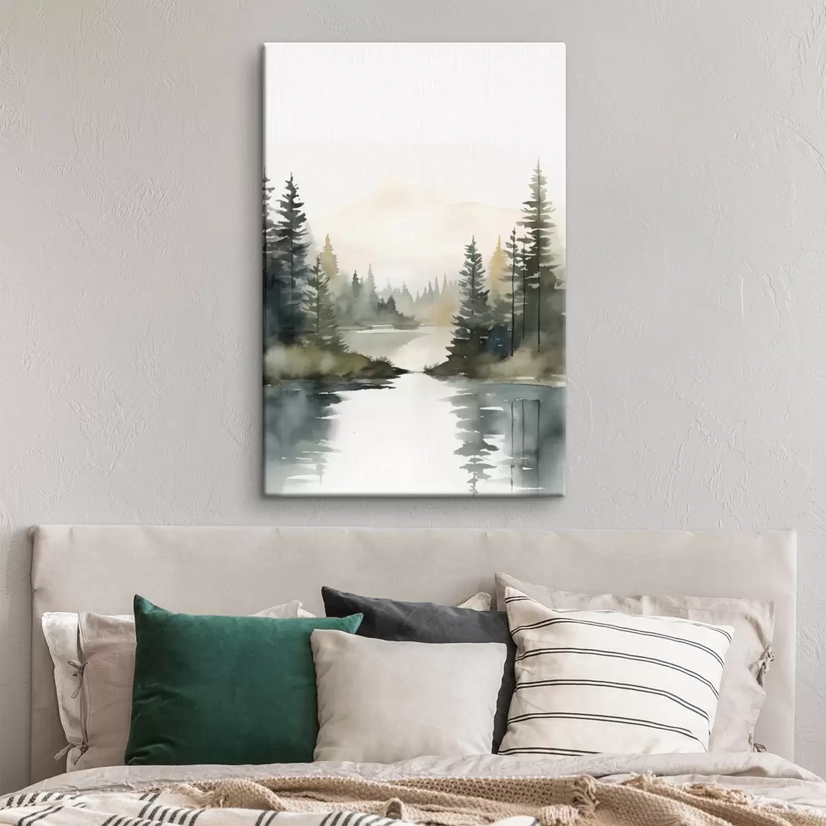 Obraz Mglisty las iglasty nad spokojną rzeką, styl akwarelowy Nr s46507