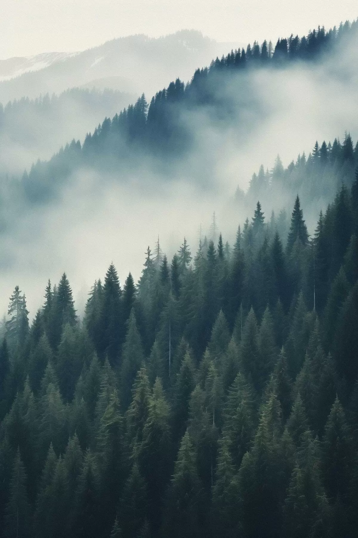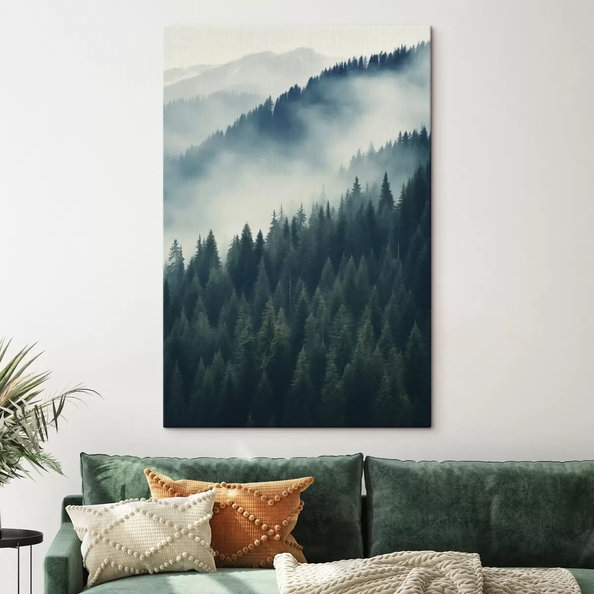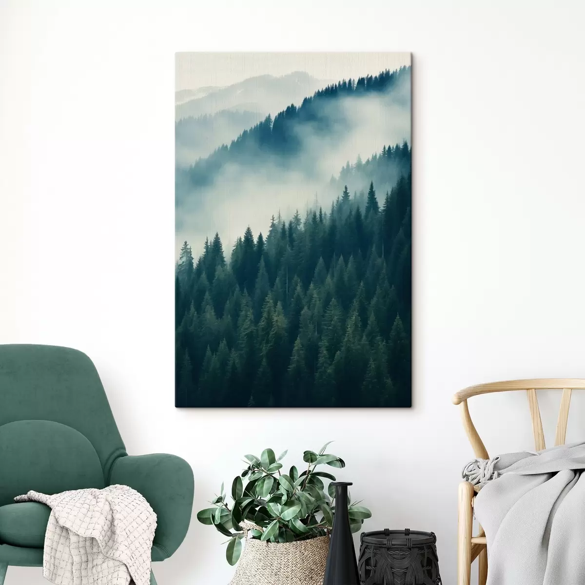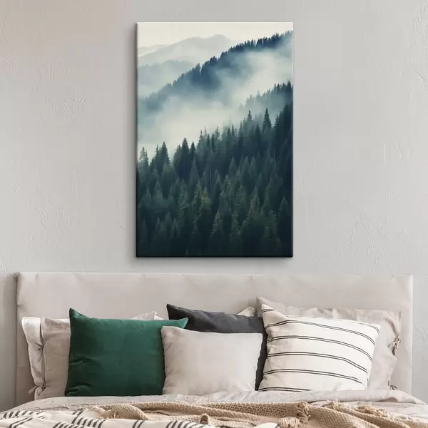 Obraz Mgła nad zboczami porośniętymi drzewami iglastymi, głębokie odcienie zieleni Nr s46516