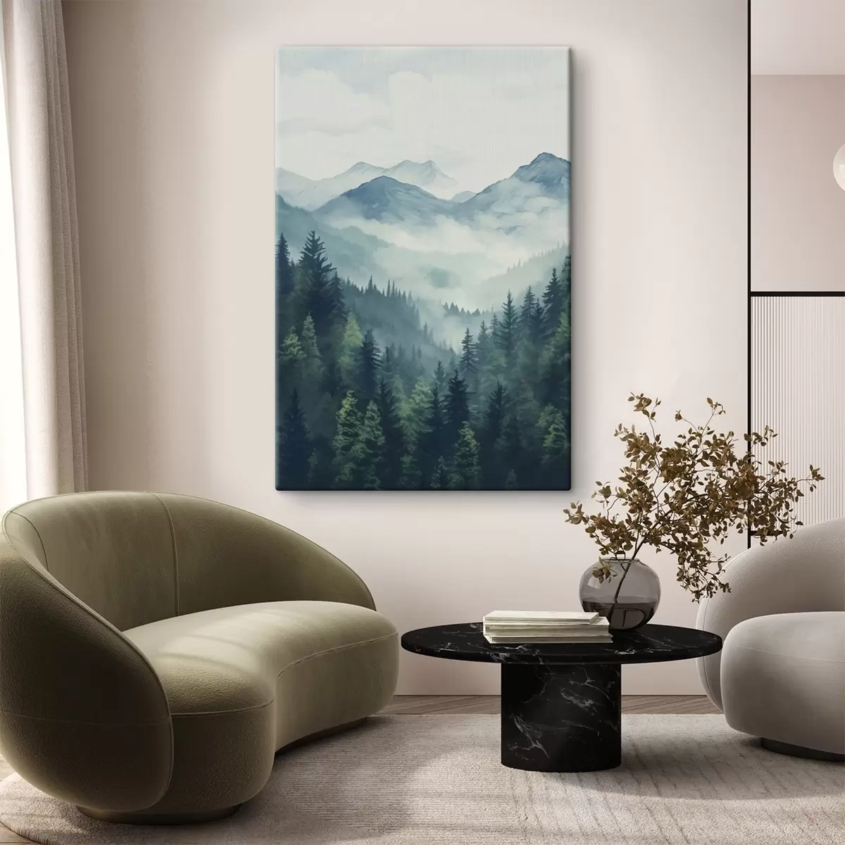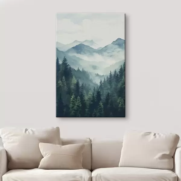 Obraz Góry i lasy w delikatnej porannej mgle, namalowane akwarelą Nr s46519