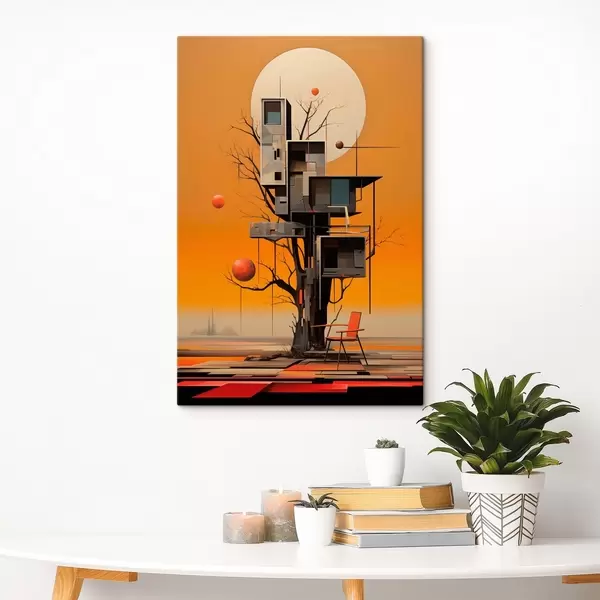 Obraz Surrealistyczny domek na drzewie na pomarańczowym tle Nr s46526