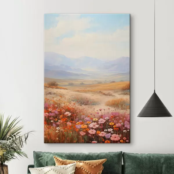 Obraz Krajobraz, pole kolorowych kwiatów z górami w tle, delikatne pastelowe kolory Nr s46685