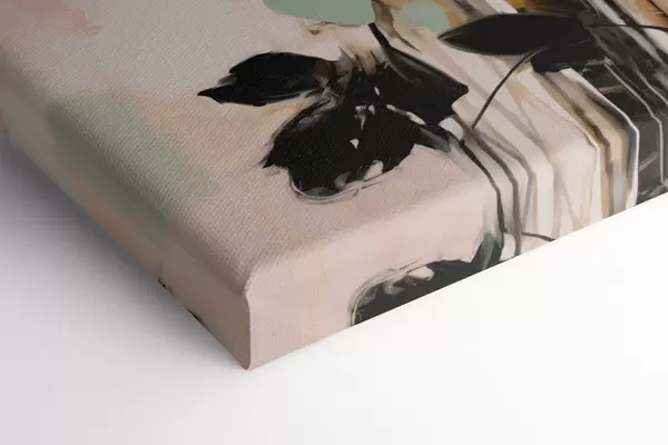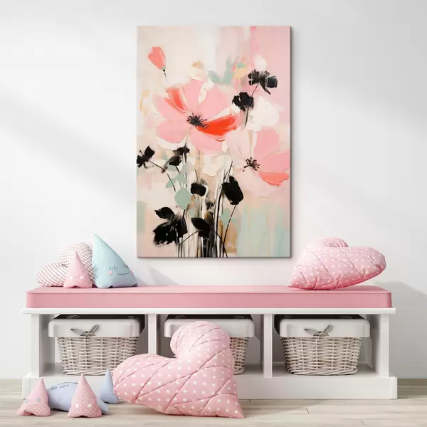 Obraz Różowe i czarne kwiaty z liśćmi, delikatne pastelowe kolory, abstrakcyjna kompozycja kwiatowa, minimalistyczna sztuka s46687
