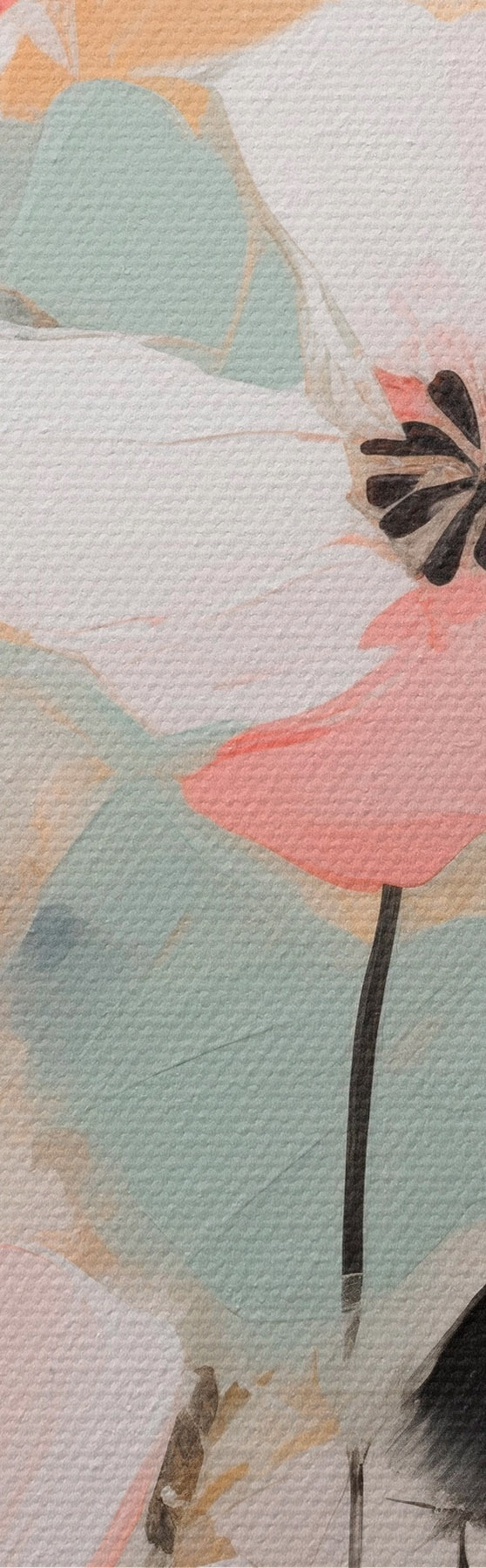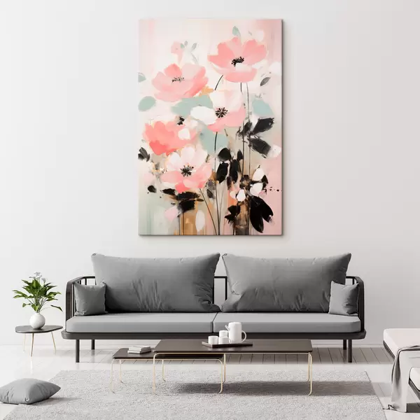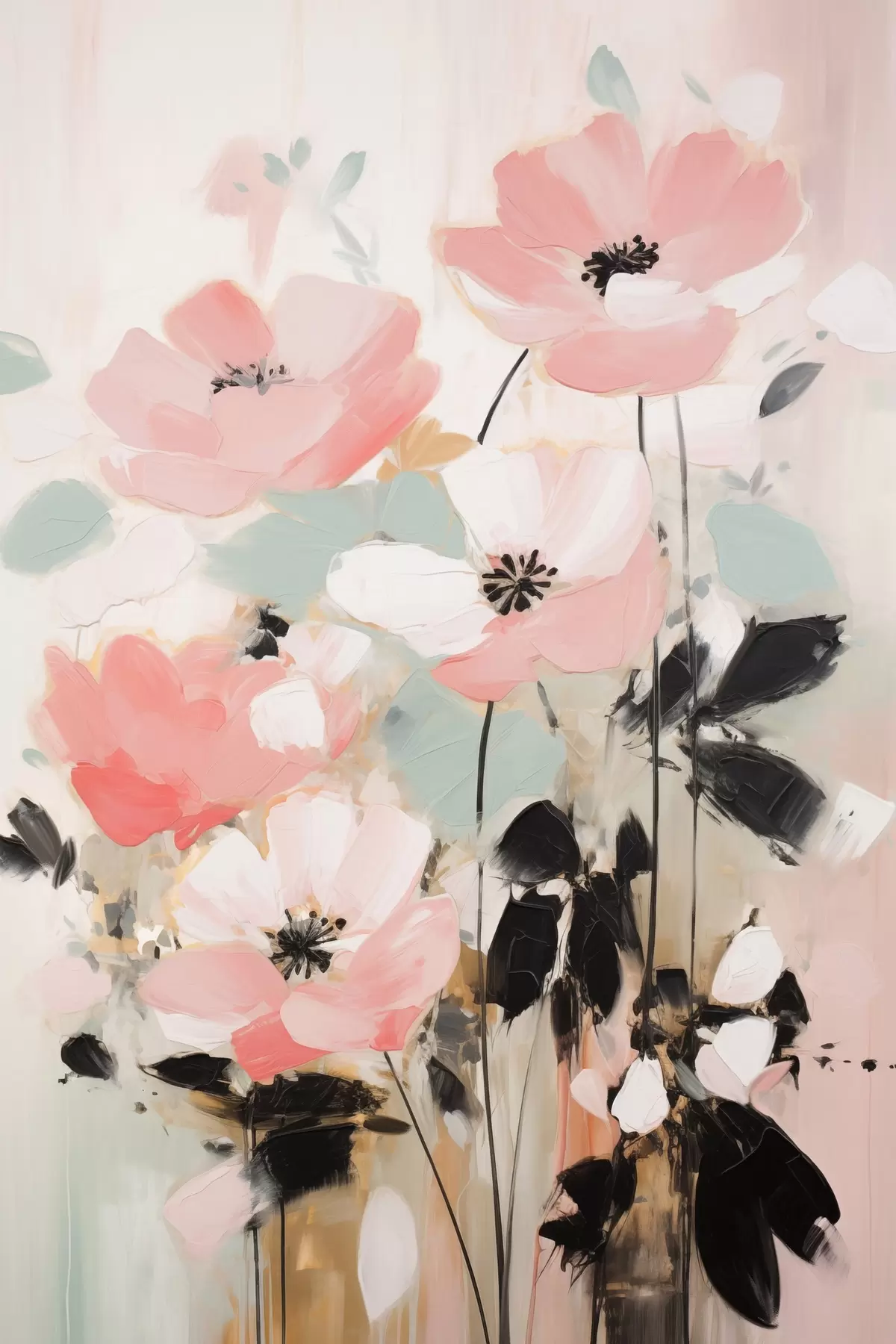 Obraz Różowe i czarne kwiaty z liśćmi, delikatne pastelowe kolory, abstrakcyjna kompozycja kwiatowa, minimalistyczna sztuka Nr s46688
