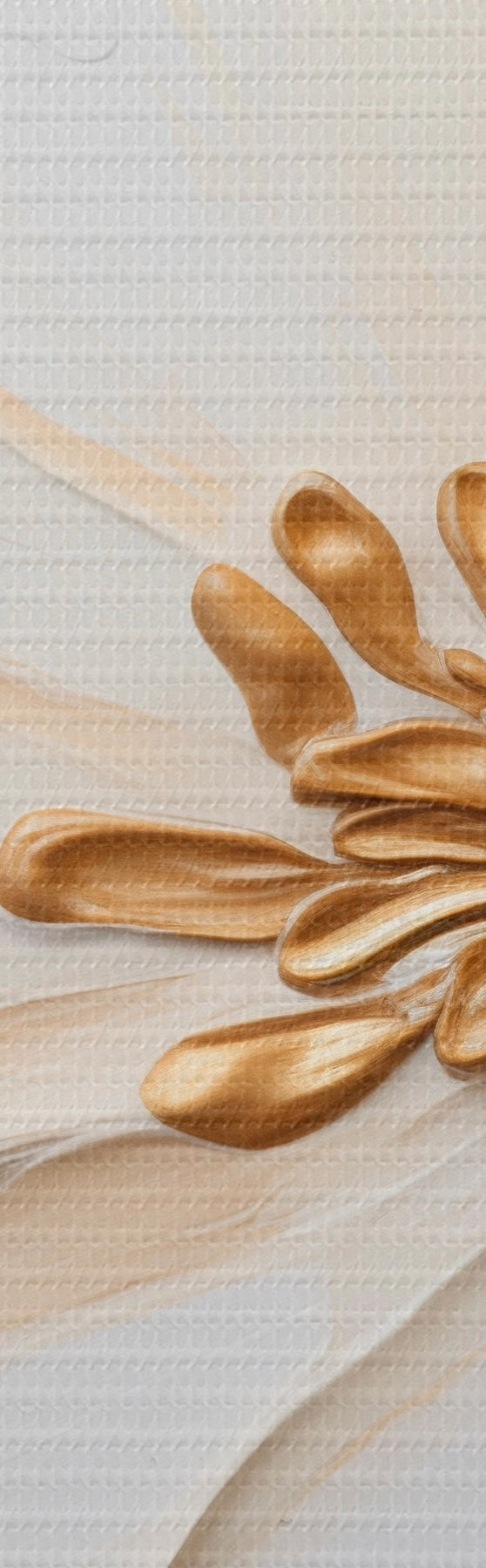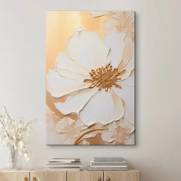 Obraz Biały kwiat o delikatnych płatkach z imitacją grubych pociągnięć pędzla, na jasnopomarańczowym tle o fakturze. Nr s46691