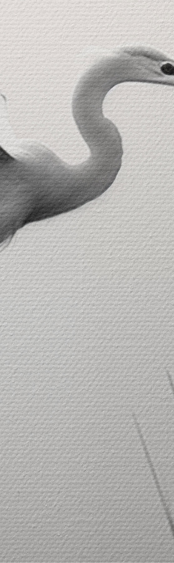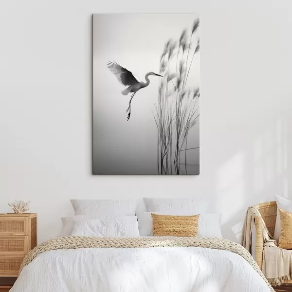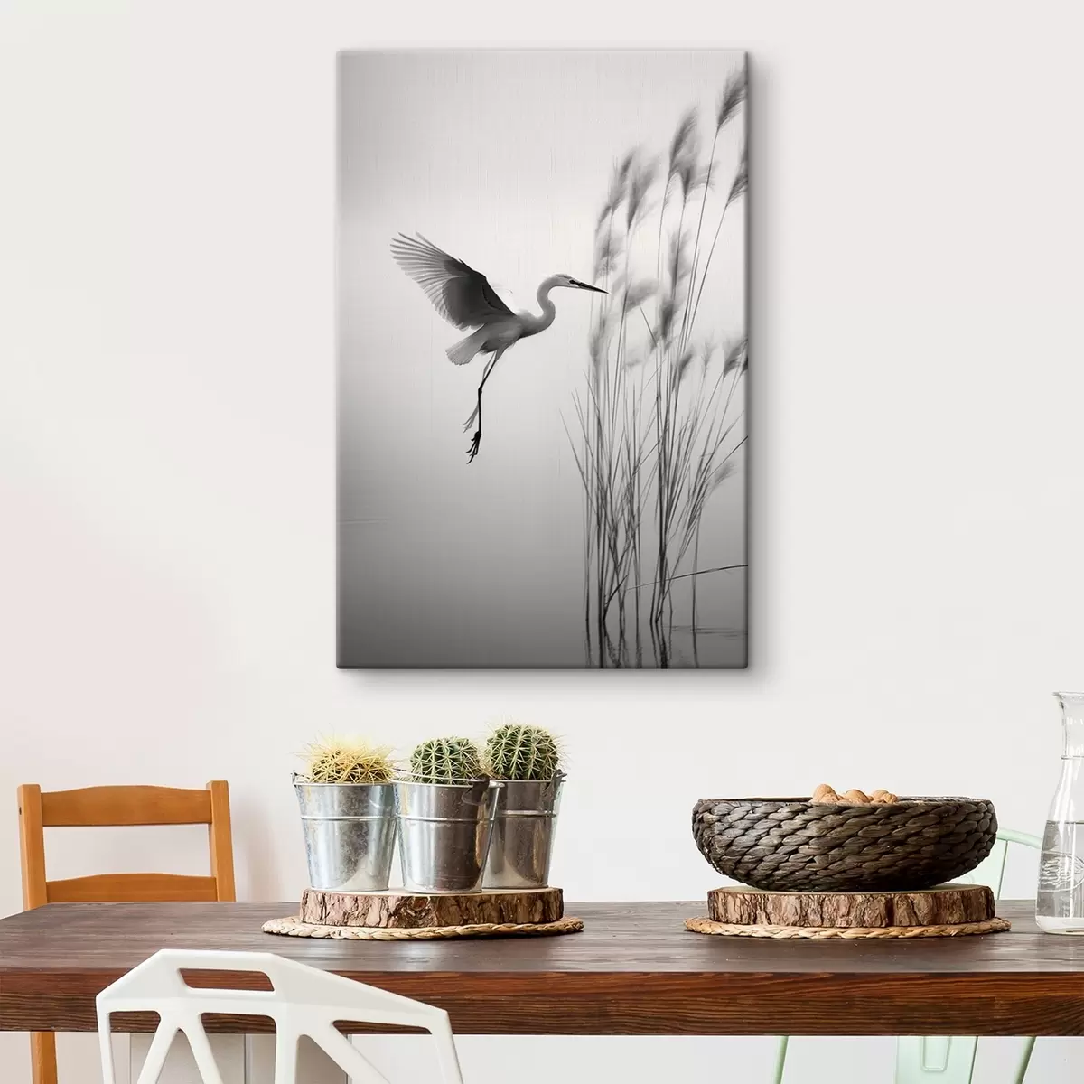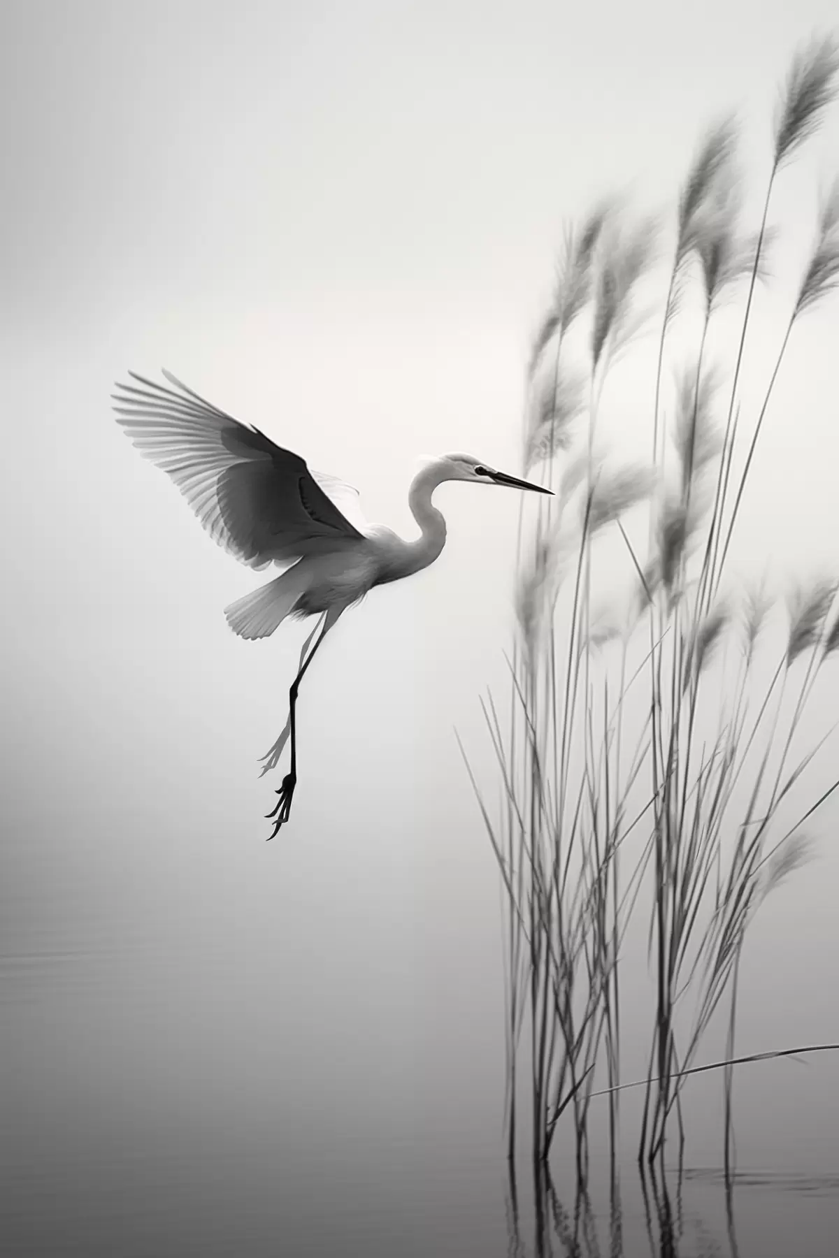 Obraz Biała czapla z rozpostartymi skrzydłami, latająca w pobliżu wysokich trzcin, czarno-biała minimalistyczna kompozycja s46693