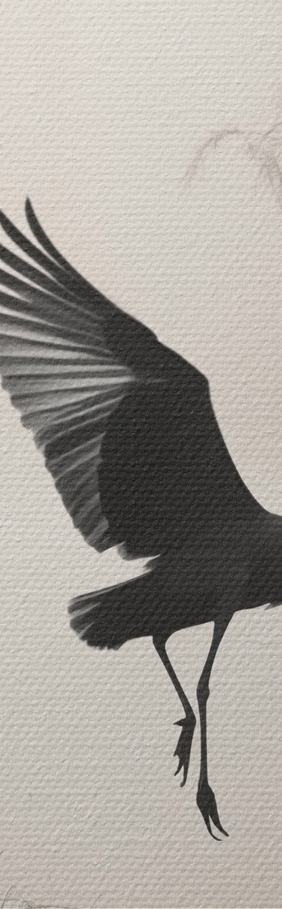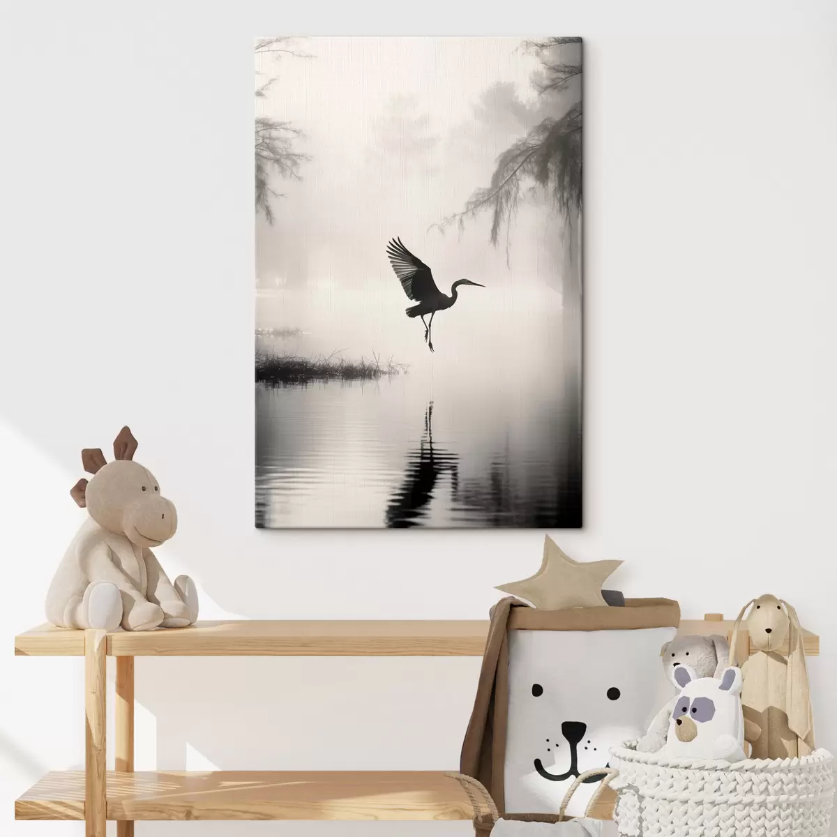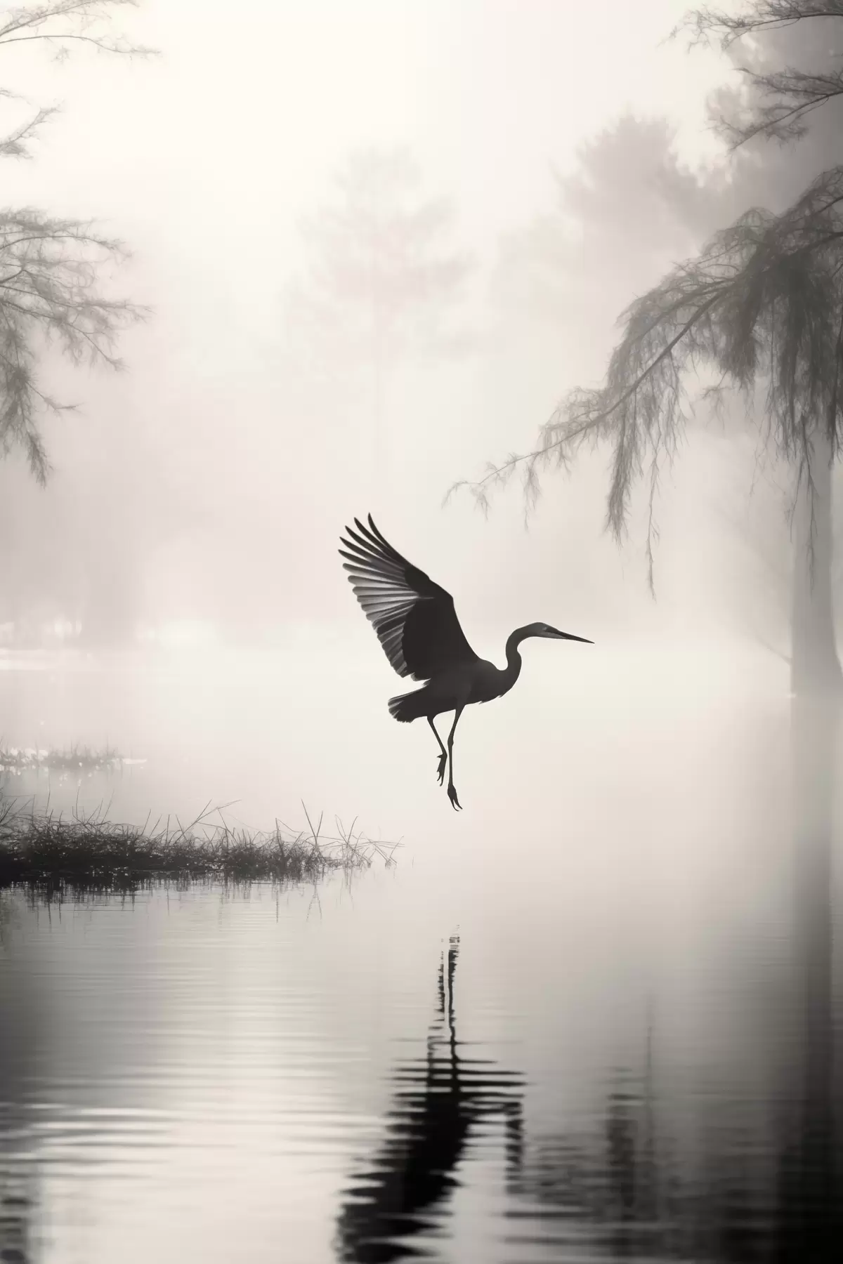 Obraz Biała czapla z rozpostartymi skrzydłami, latająca w pobliżu wysokich trzcin, czarno-biała minimalistyczna kompozycja s46694