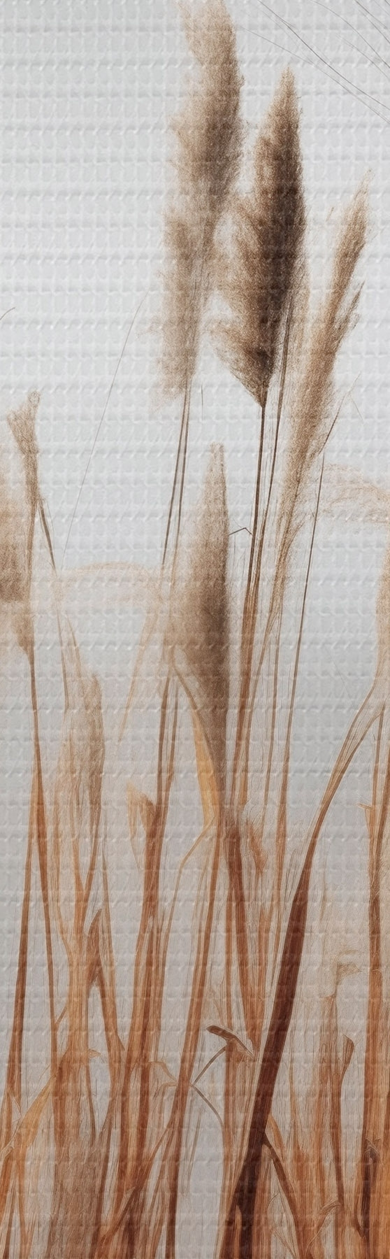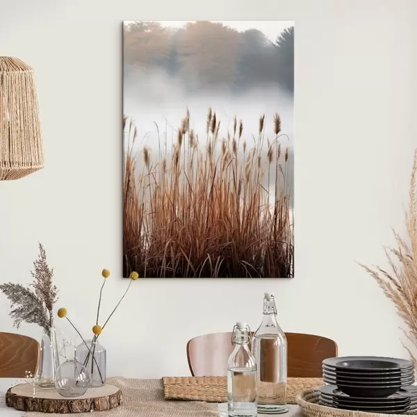 Obraz Wysokie trzciny rosnące w zbiorniku wodnym, woda odbija trzciny, mgliste tło, miękkie światło, scena natury Nr s46696