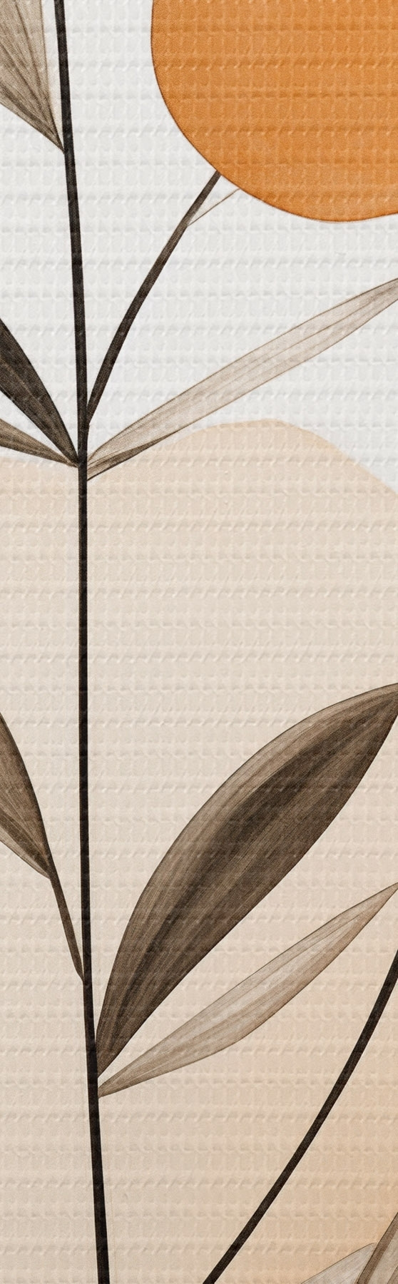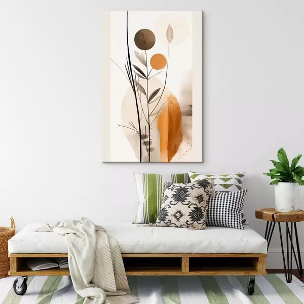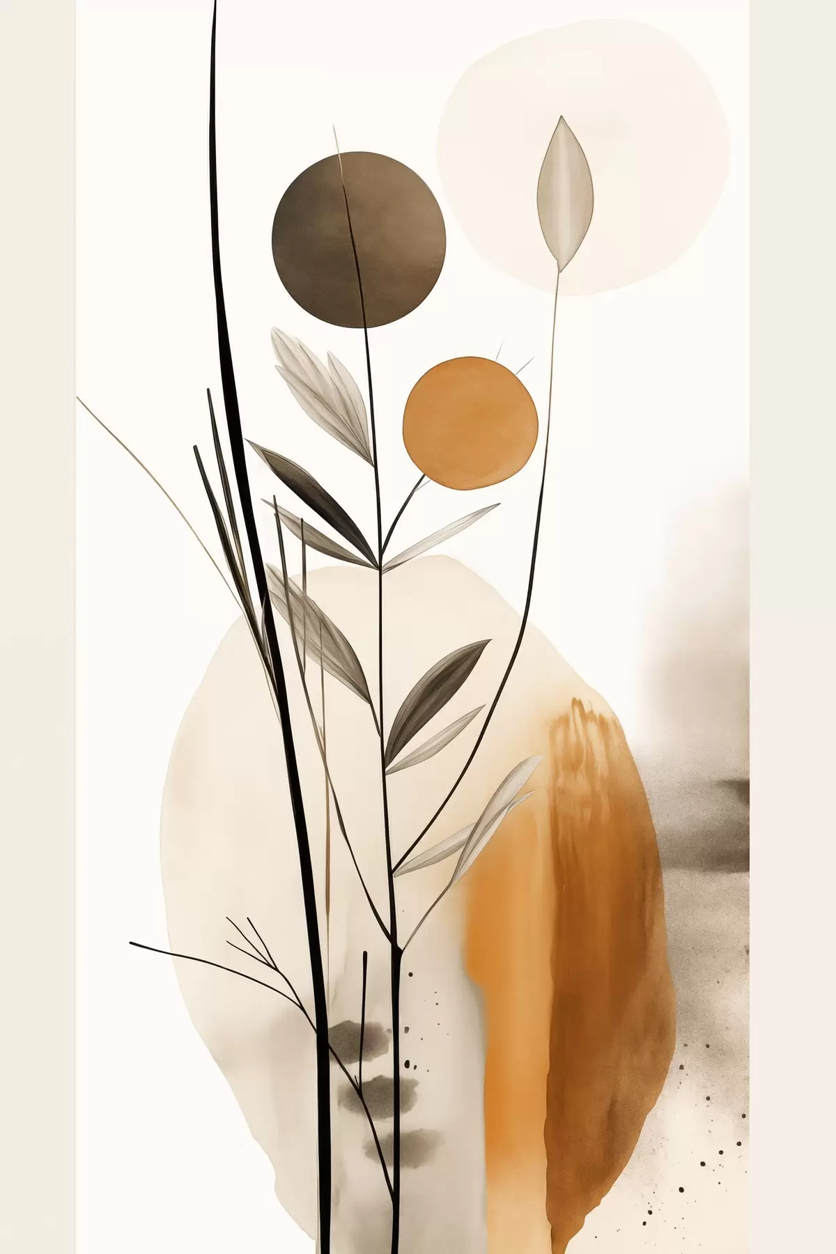 Obraz Imitacja malarstwa abstrakcyjnego z pomarańczowymi i szarymi okręgami, liśćmi i gałęziami, styl nowoczesny, efekt akwareli Nr s46698