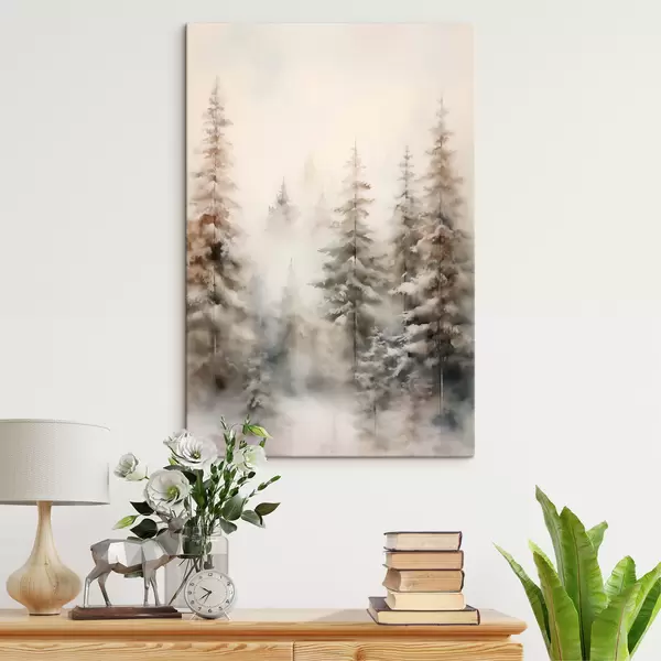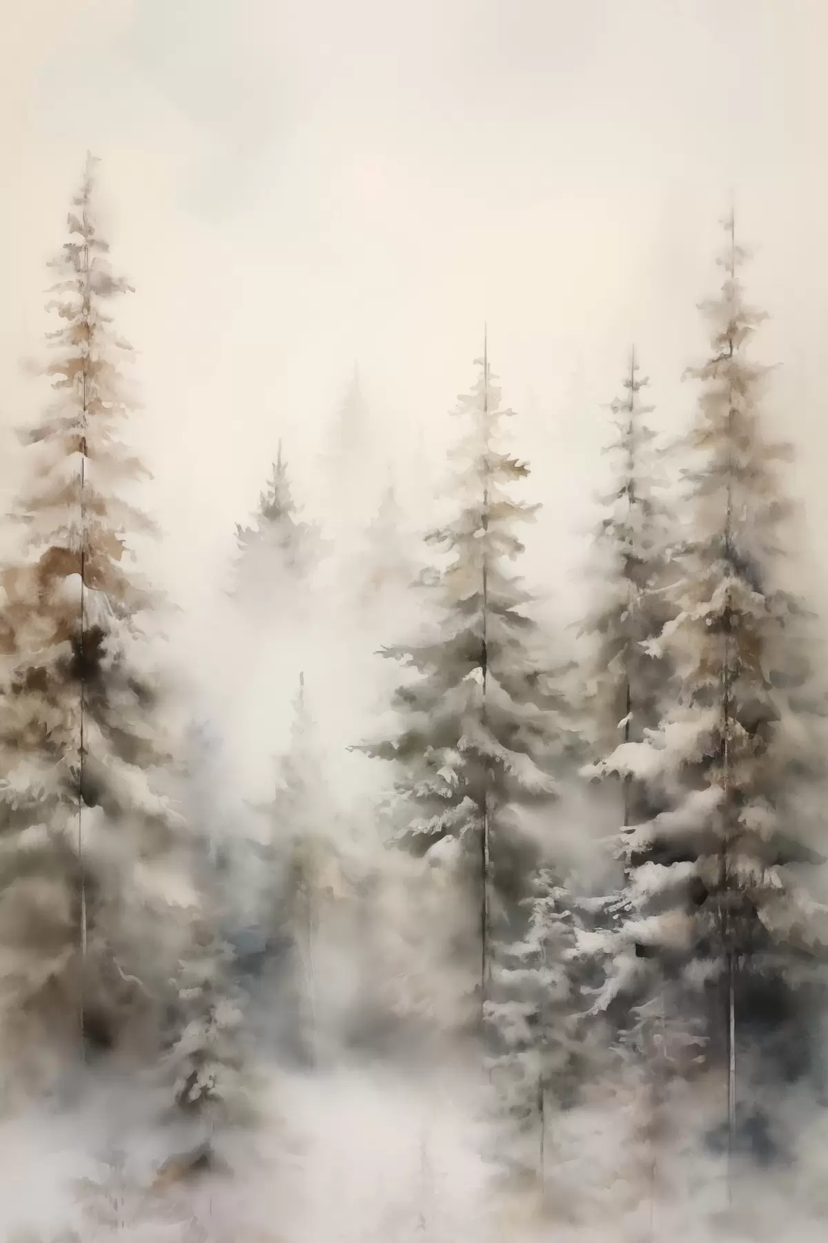 Obraz Wysokie sosny pokryte śniegiem, stojące w zamglonym lesie, delikatna, stonowana zimowa sceneria. Nr s46701