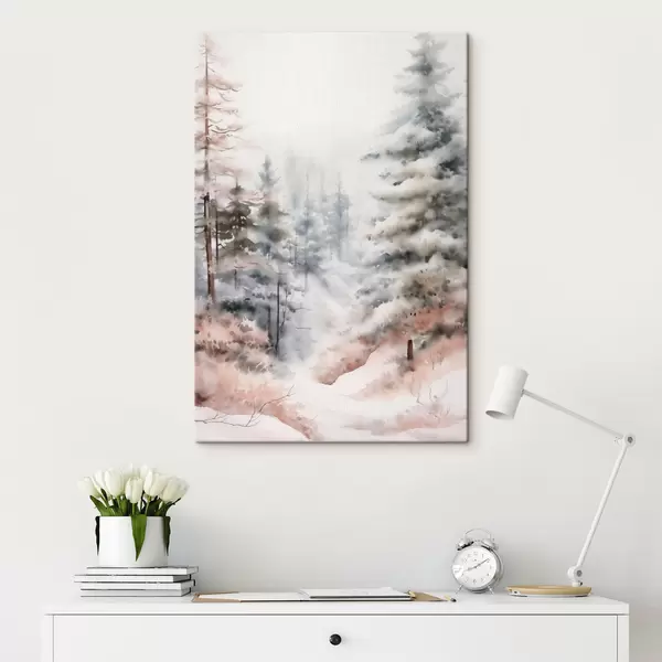 Obraz Wysokie sosny pokryte śniegiem, stojące w zamglonym lesie, delikatna, stonowana zimowa sceneria. Nr s46702