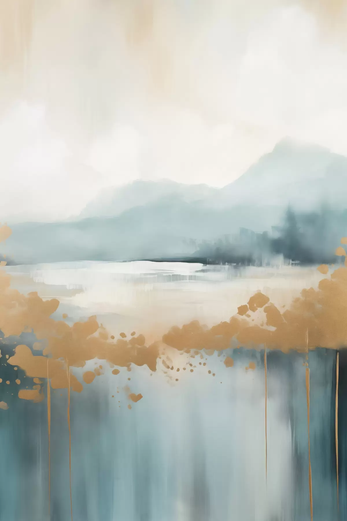 Obraz Abstrakcyjny pejzaż z górami i jeziorem w kolorze turkusowym i teksturowanej żółci, delikatne pociągnięcia pędzla, minimalistyczna grafika Nr s46703