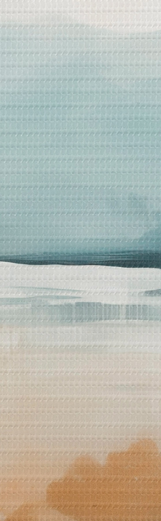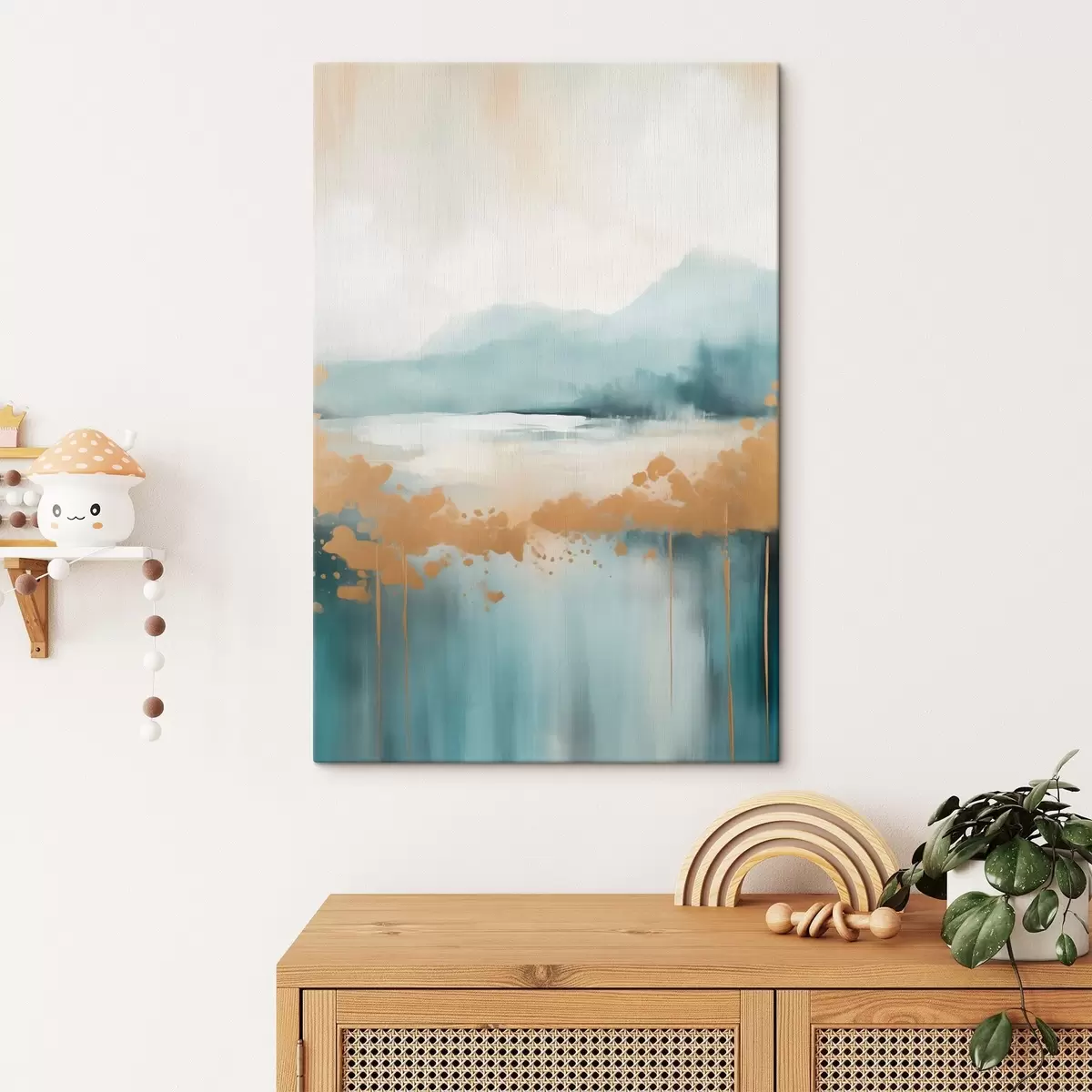 Obraz Abstrakcyjny pejzaż z górami i jeziorem w kolorze turkusowym i teksturowanej żółci, delikatne pociągnięcia pędzla, minimalistyczna grafika s46703