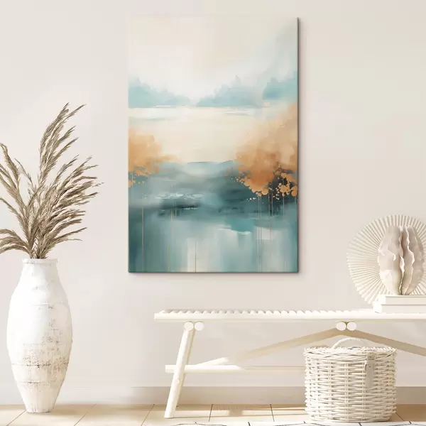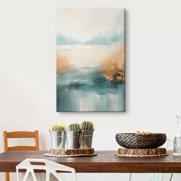 Obraz Abstrakcyjny pejzaż z górami i jeziorem w kolorze turkusowym i teksturowanej żółci, delikatne pociągnięcia pędzla, minimalistyczna grafika s46704