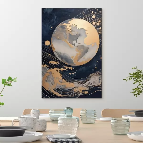 Obraz Teksturowana dekoracyjna planeta z żółtymi liniami w tle, żółtymi kropkami w tle, ciemnym tłem s46708