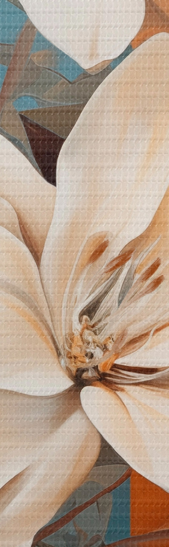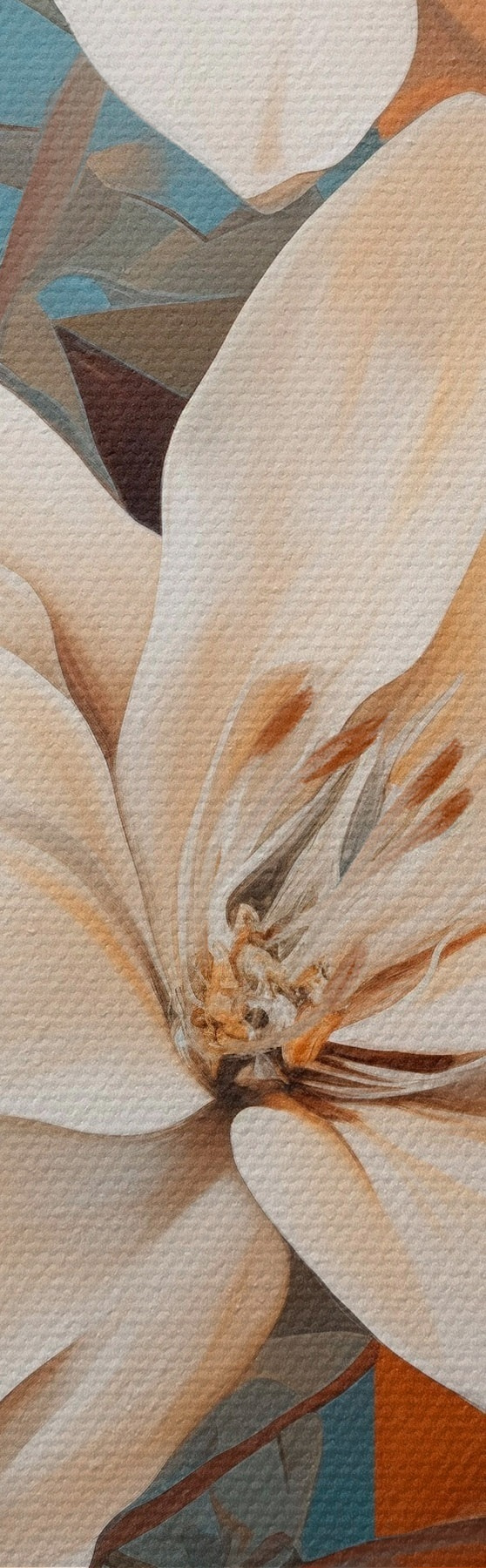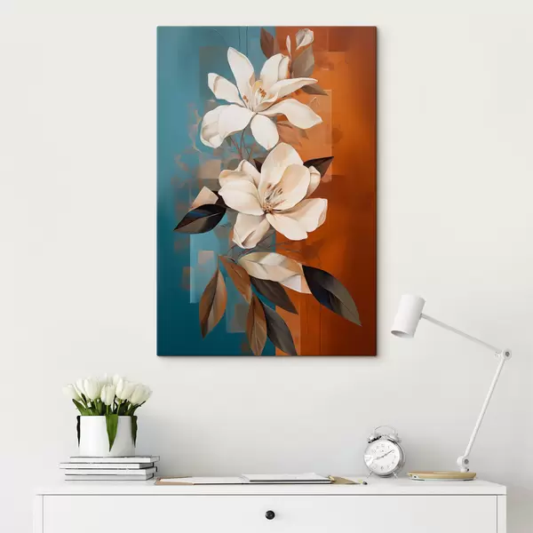 Obraz Abstrakcyjne białe kwiaty i liście na tle brązowym i niebieskim z abstrakcyjnymi kształtami, w minimalistycznym stylu. Nr s46710