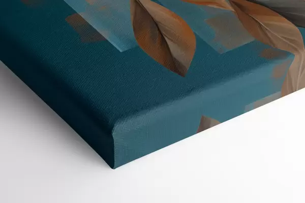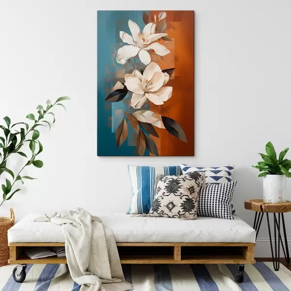 Obraz Abstrakcyjne białe kwiaty i liście na tle brązowym i niebieskim z abstrakcyjnymi kształtami, w minimalistycznym stylu. s46710