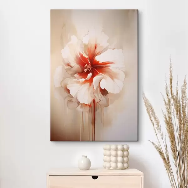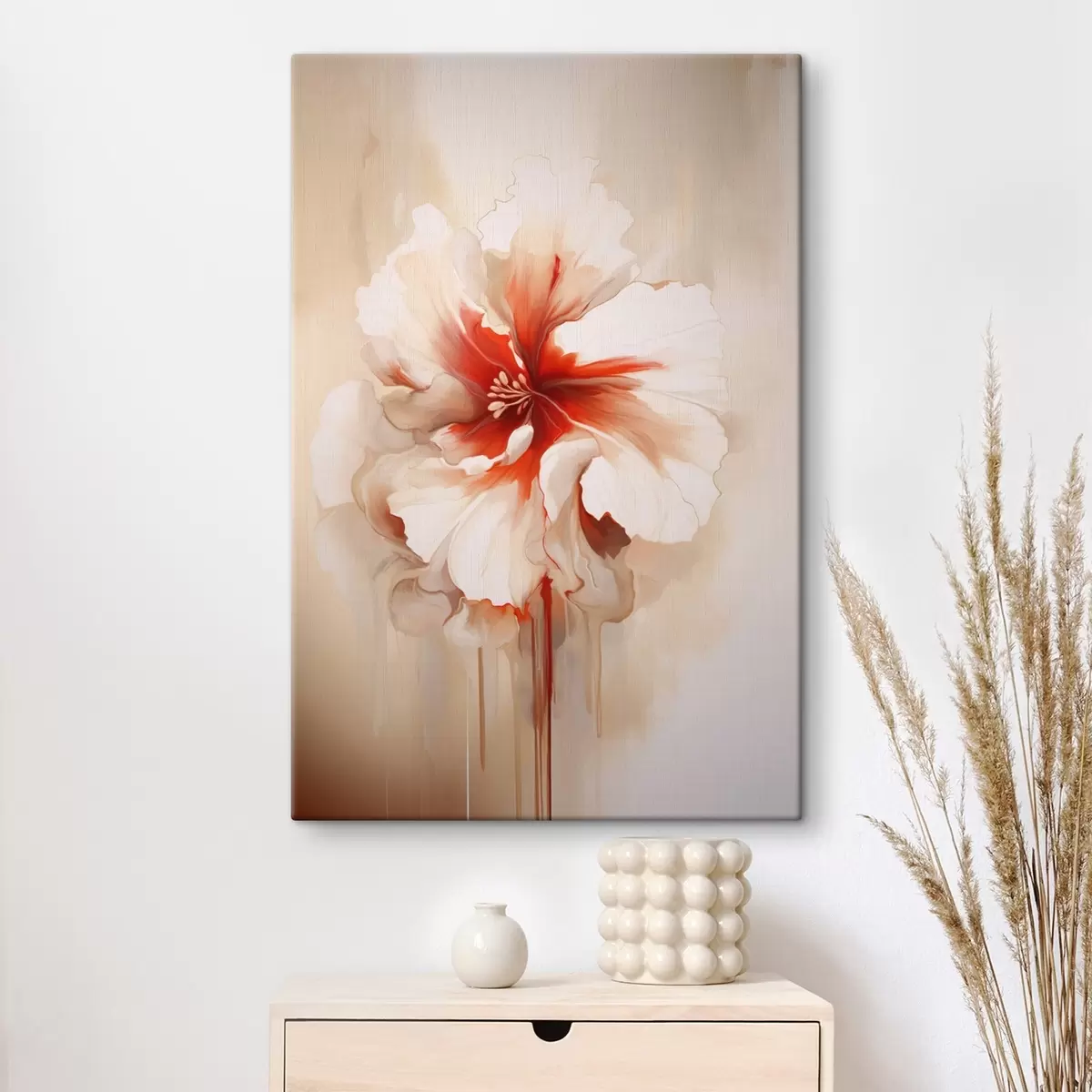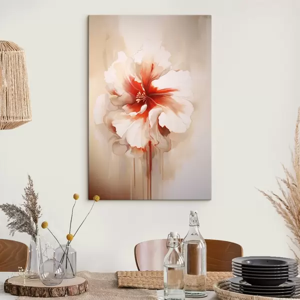 Obraz Biały i czerwony kwiat z półprzezroczystymi płatkami i płynącymi kroplami farby Nr s46940