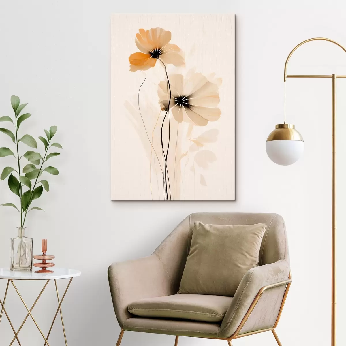Obraz Kwiaty w beżowo-brzoskwiniowej palecie kolorów z ciemnymi środkami w minimalistycznym stylu s46945