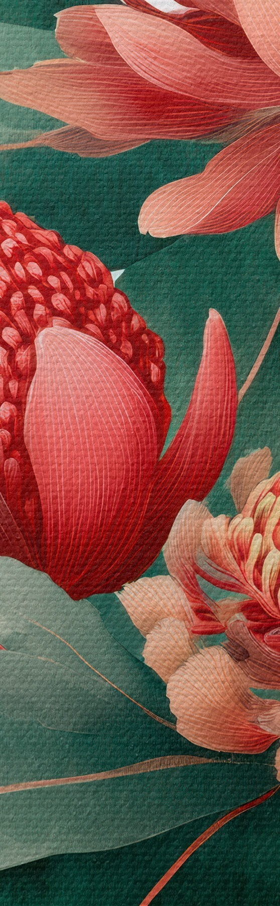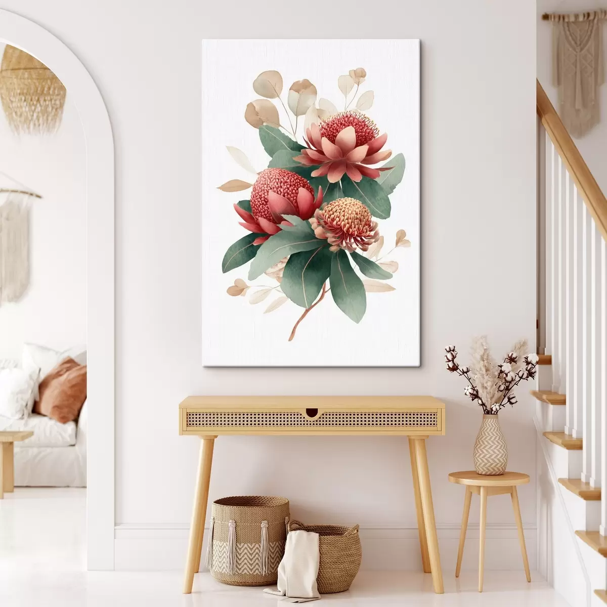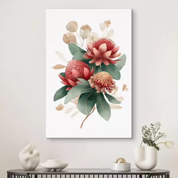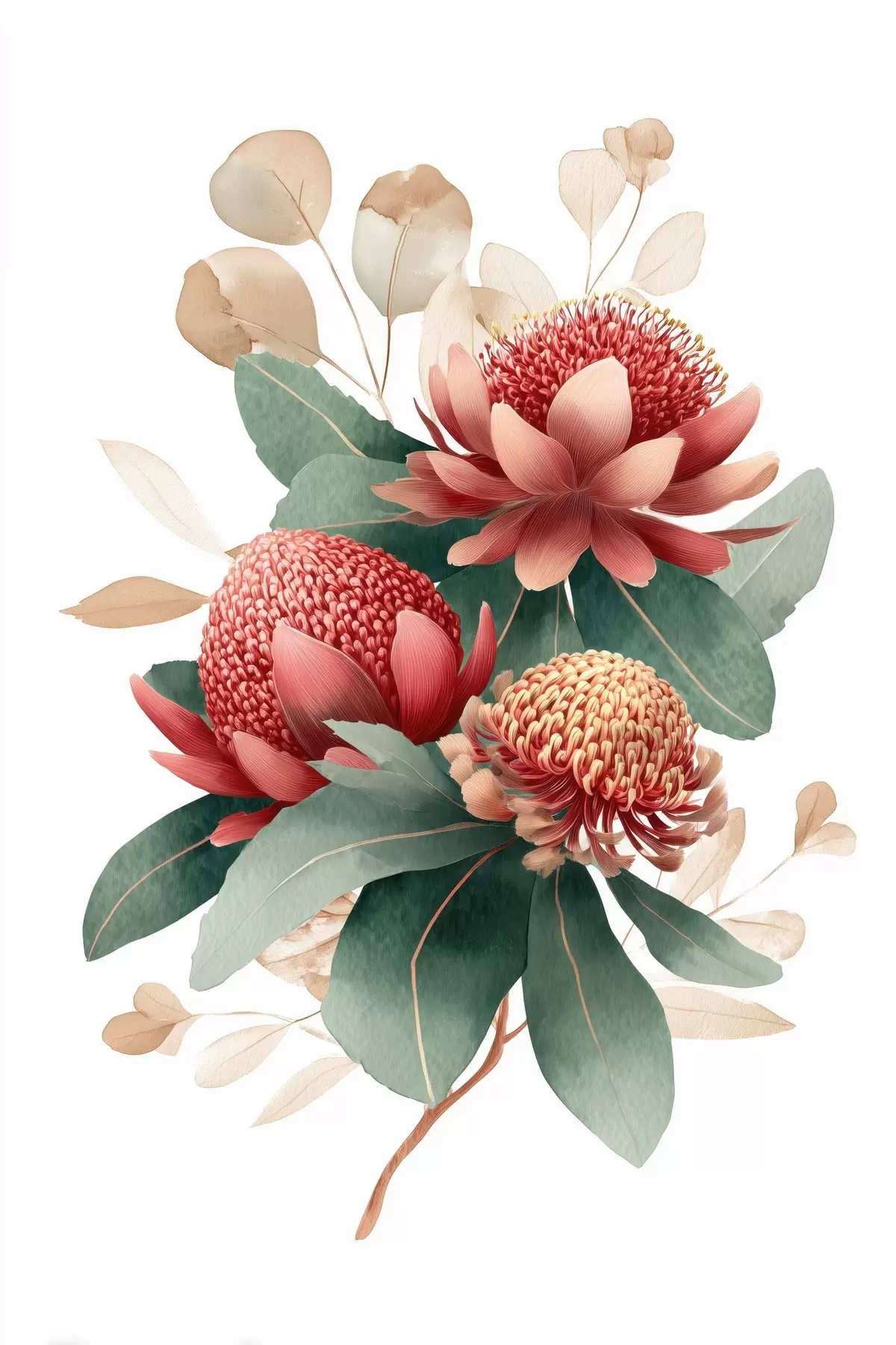 Obraz Kompozycja kwiatowa z dużymi proteami i eukaliptusem w nowoczesnym stylu ilustracji cyfrowej Nr s46955
