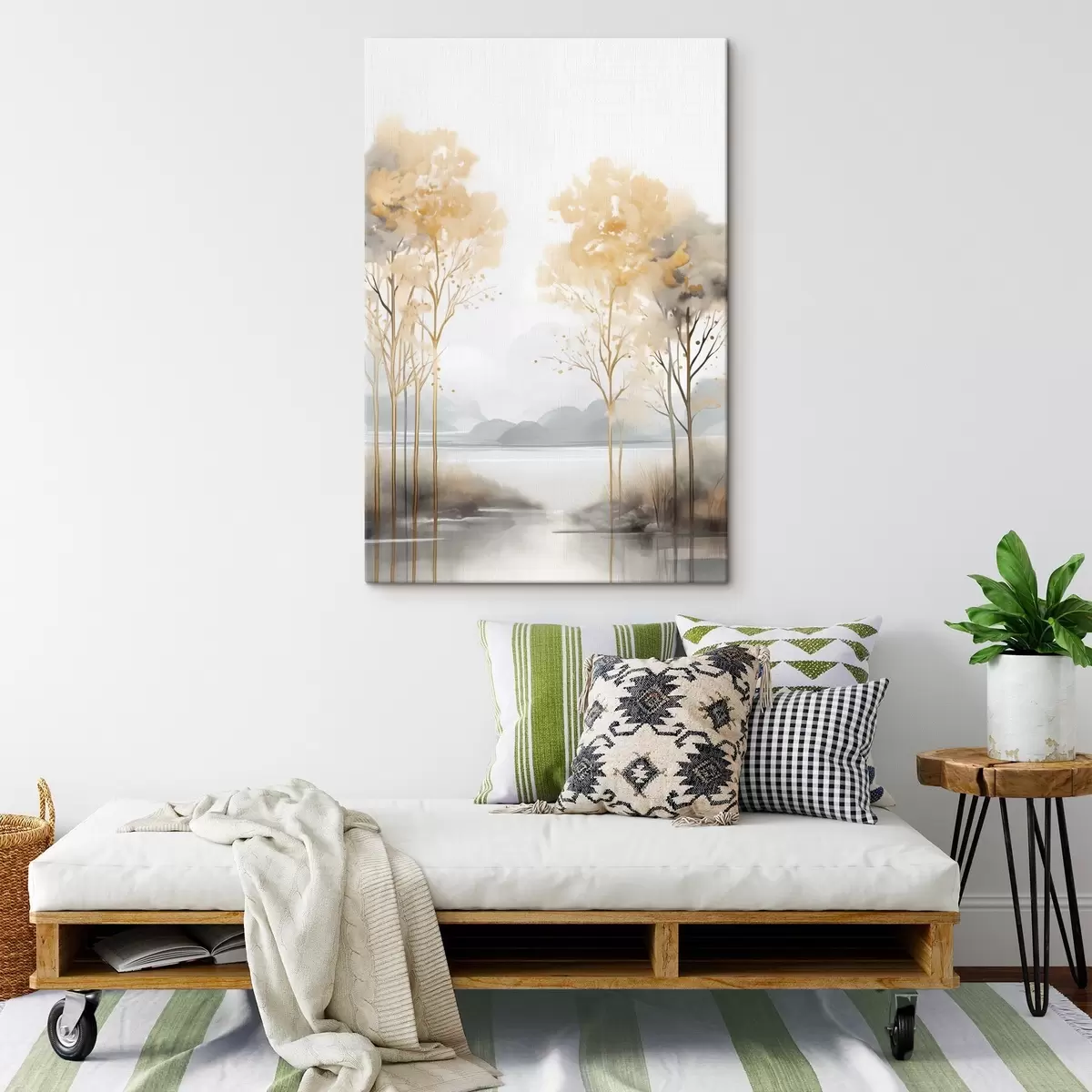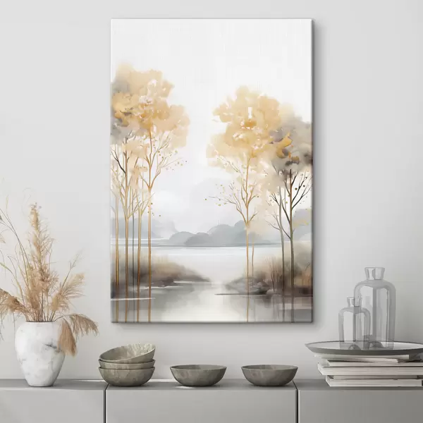 Obraz Dekoracyjny abstrakcyjny krajobraz, wysokie drzewa z żółtymi liśćmi, rzeka i mgła w tle Nr s47015