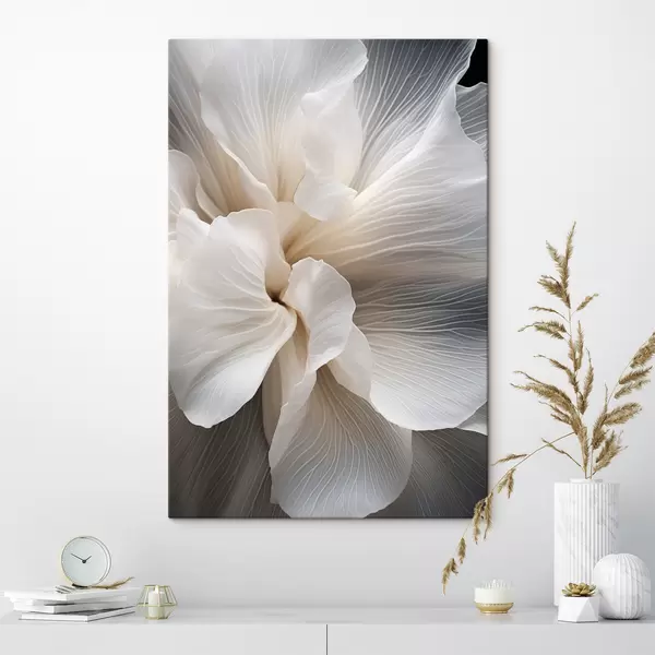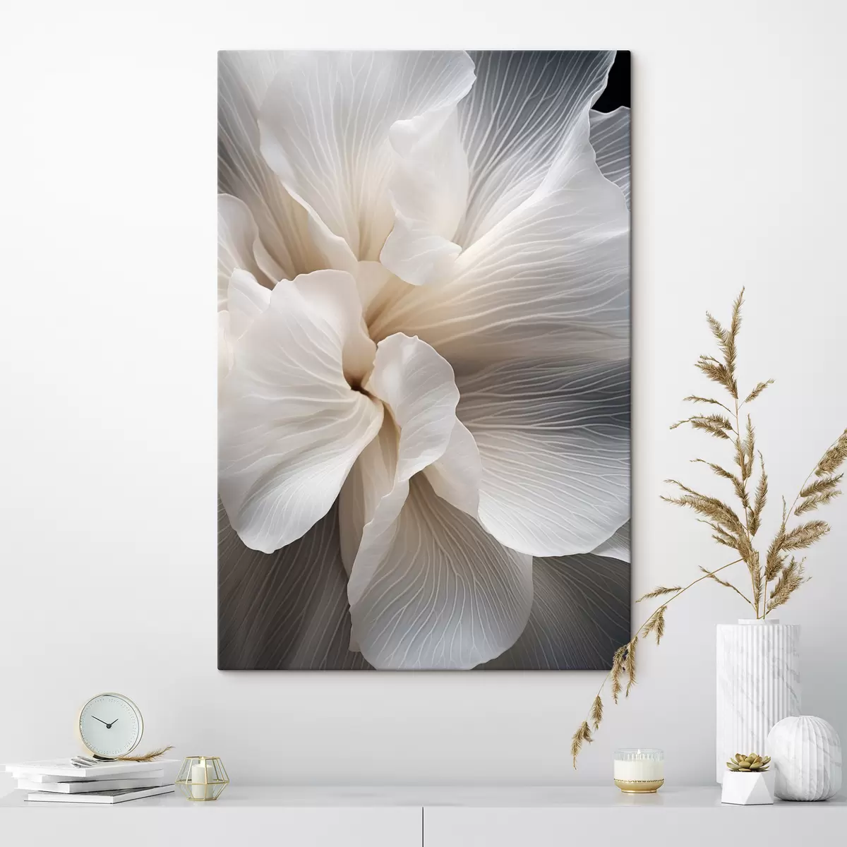 Obraz Zbliżenie na delikatne, abstrakcyjne białe płatki kwiatów o skomplikowanych liniach i zamazanym ciemnym tle. Nr s47018
