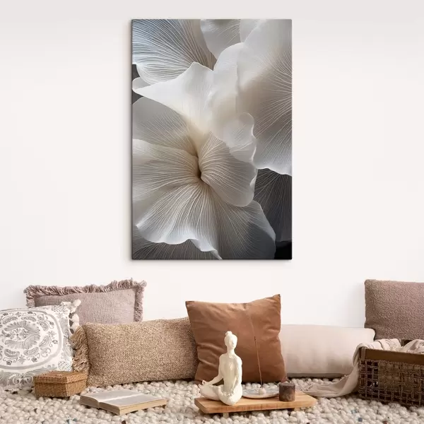 Obraz Zbliżenie na delikatne, abstrakcyjne białe płatki kwiatów o skomplikowanych liniach i zamazanym ciemnym tle. Nr s47019