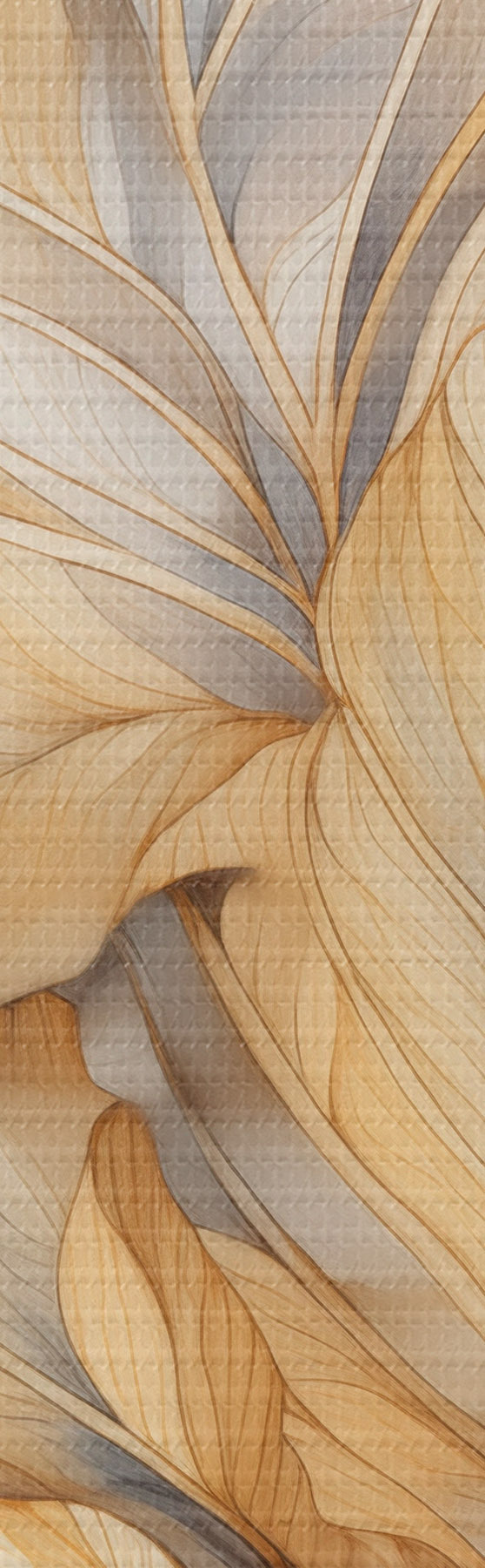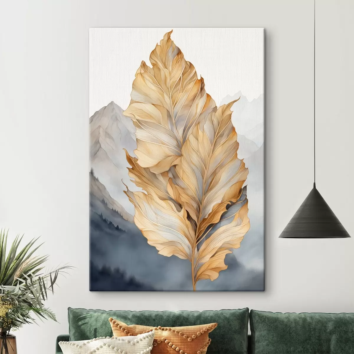Obraz Abstrakcyjne, duże, żółte i brązowe liście o skomplikowanych szczegółach na tle górskiego krajobrazu. Nr s47022
