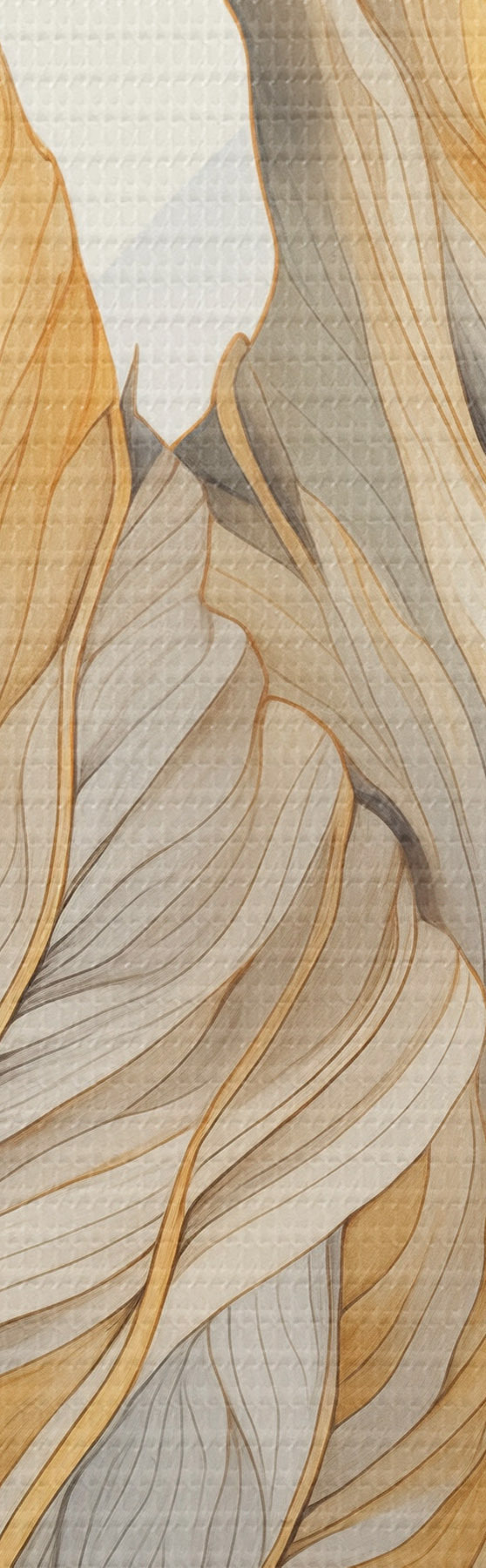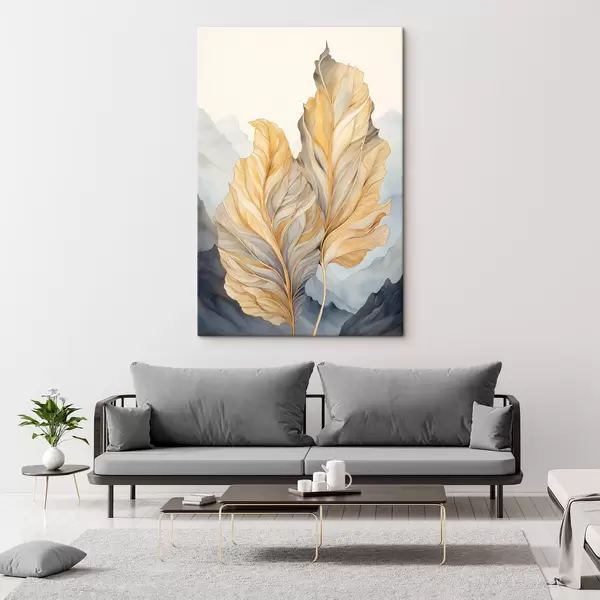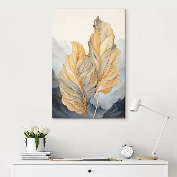Obraz Abstrakcyjne, duże, żółte i brązowe liście o skomplikowanych szczegółach na tle górskiego krajobrazu. Nr s47023