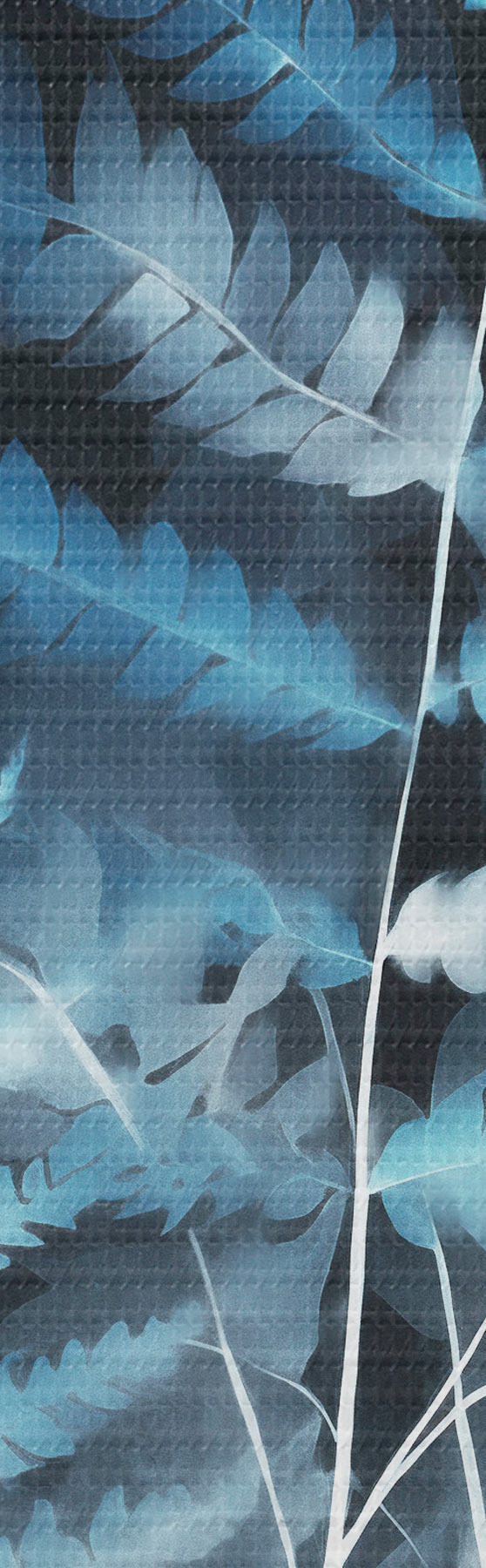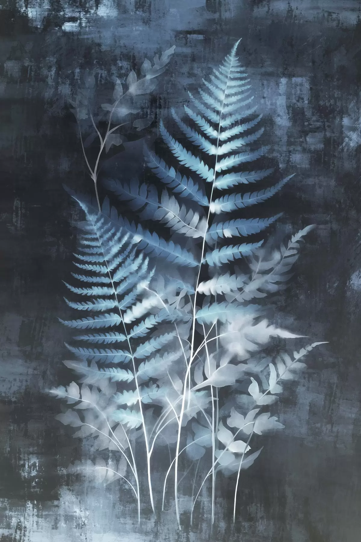 Obraz Niebieskie paprocie i rośliny na ciemnym, teksturowanym tle, z naciskiem na skomplikowane detale, efekt rentgenowski Nr s47026