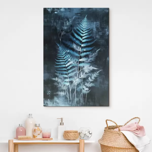 Obraz Niebieskie paprocie i rośliny na ciemnym, teksturowanym tle, z naciskiem na skomplikowane detale, efekt rentgenowski s47026