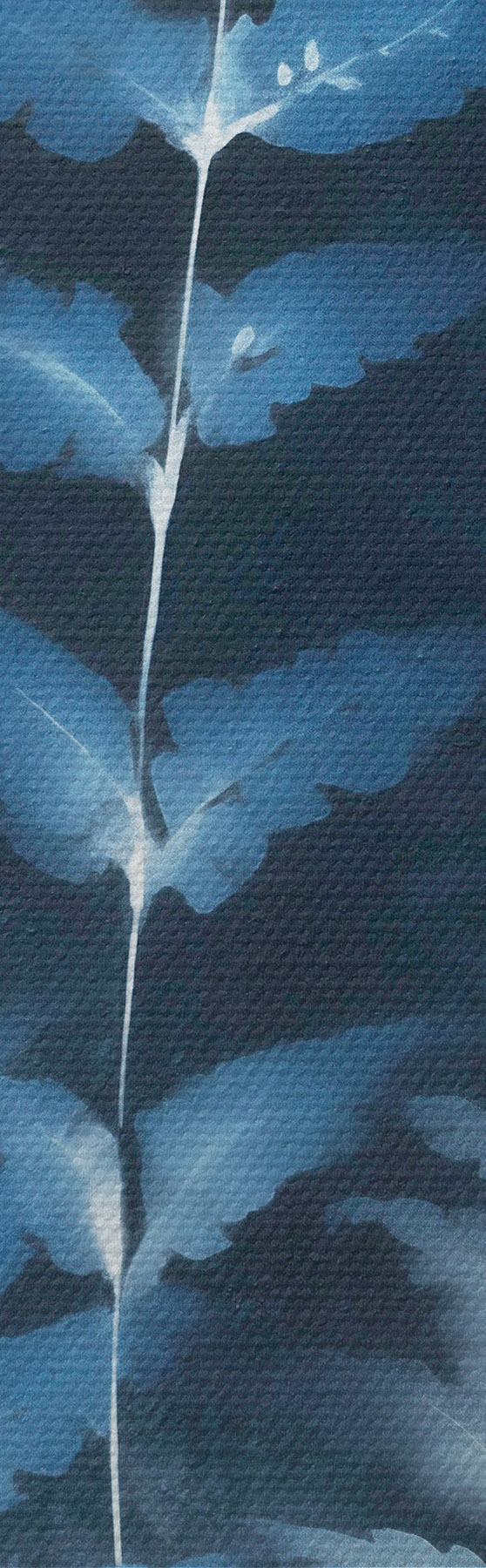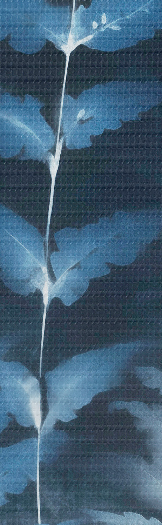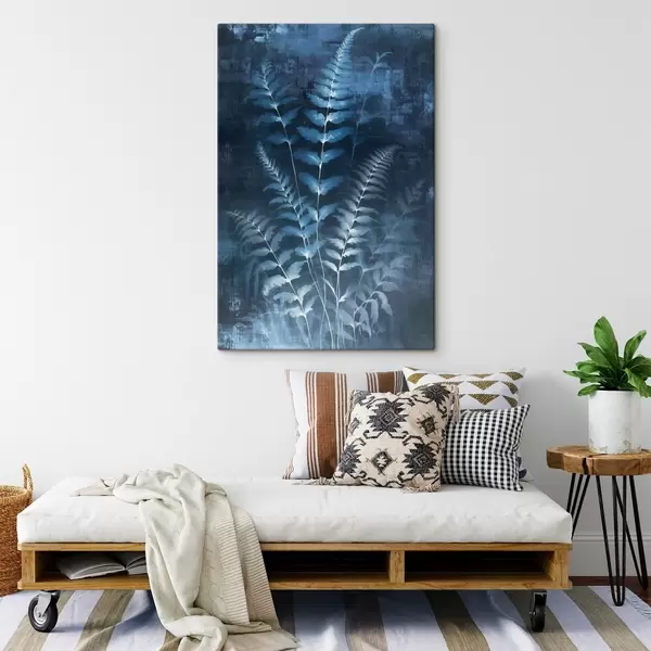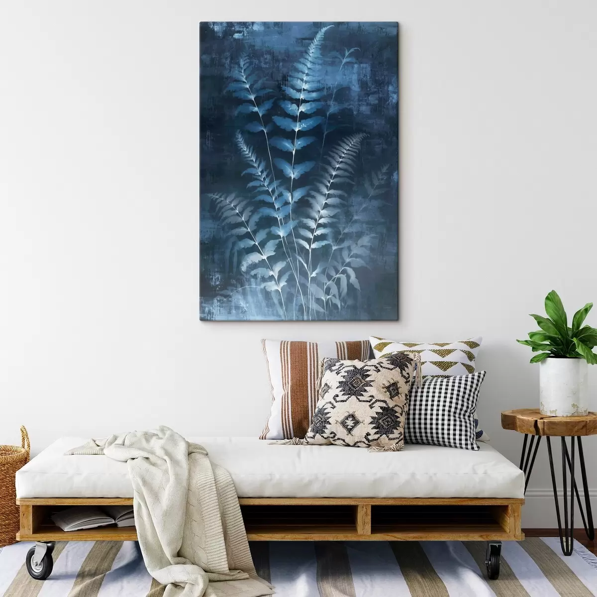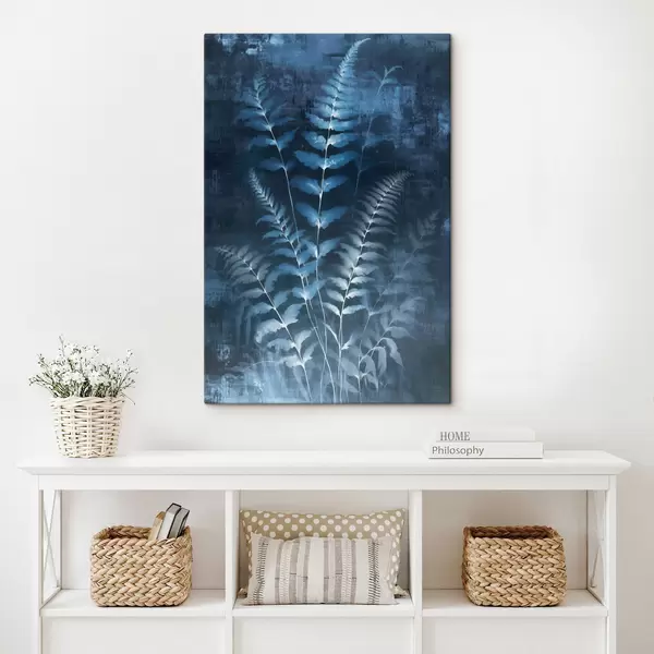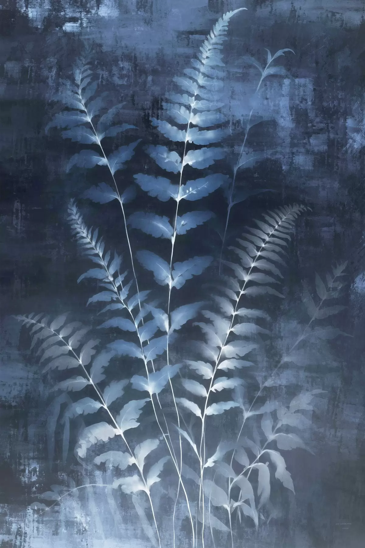 Obraz Niebieskie paprocie i rośliny na ciemnym, teksturowanym tle, z naciskiem na skomplikowane detale, efekt rentgenowski. Nr s47027
