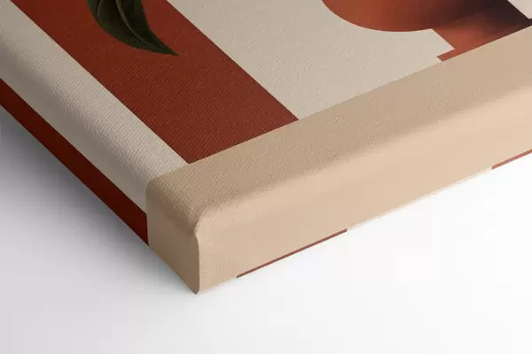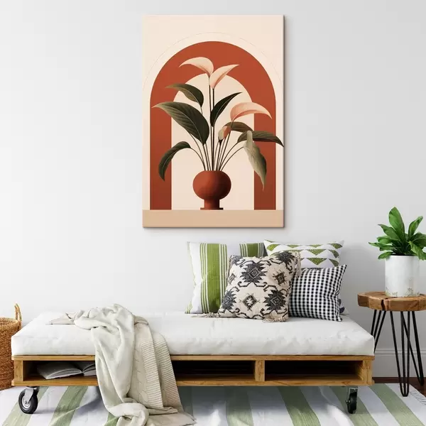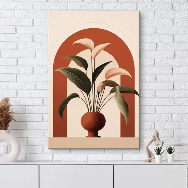 Obraz Abstrakcyjna roślina doniczkowa z dużymi zielonymi i beżowymi liśćmi przed kremową bramą z akcentami terakoty. Nr s47032