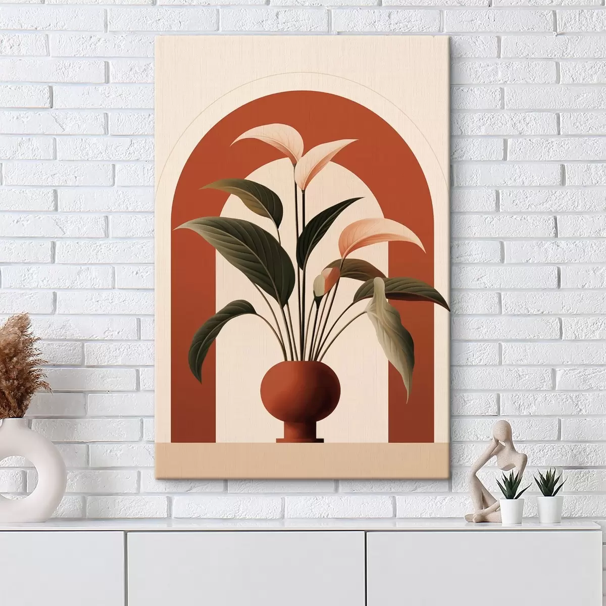 Obraz Abstrakcyjna roślina doniczkowa z dużymi zielonymi i beżowymi liśćmi przed kremową bramą z akcentami terakoty. s47032