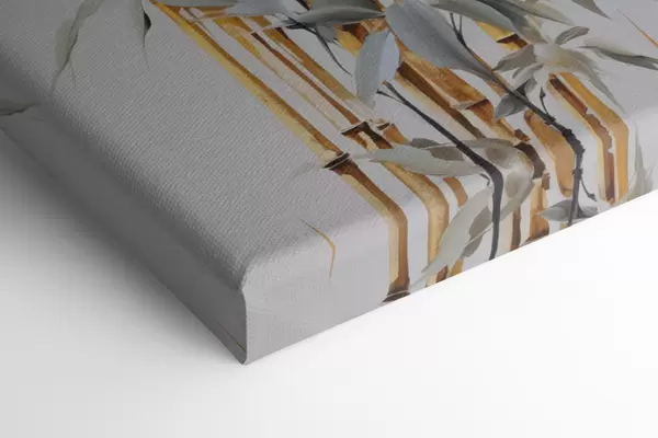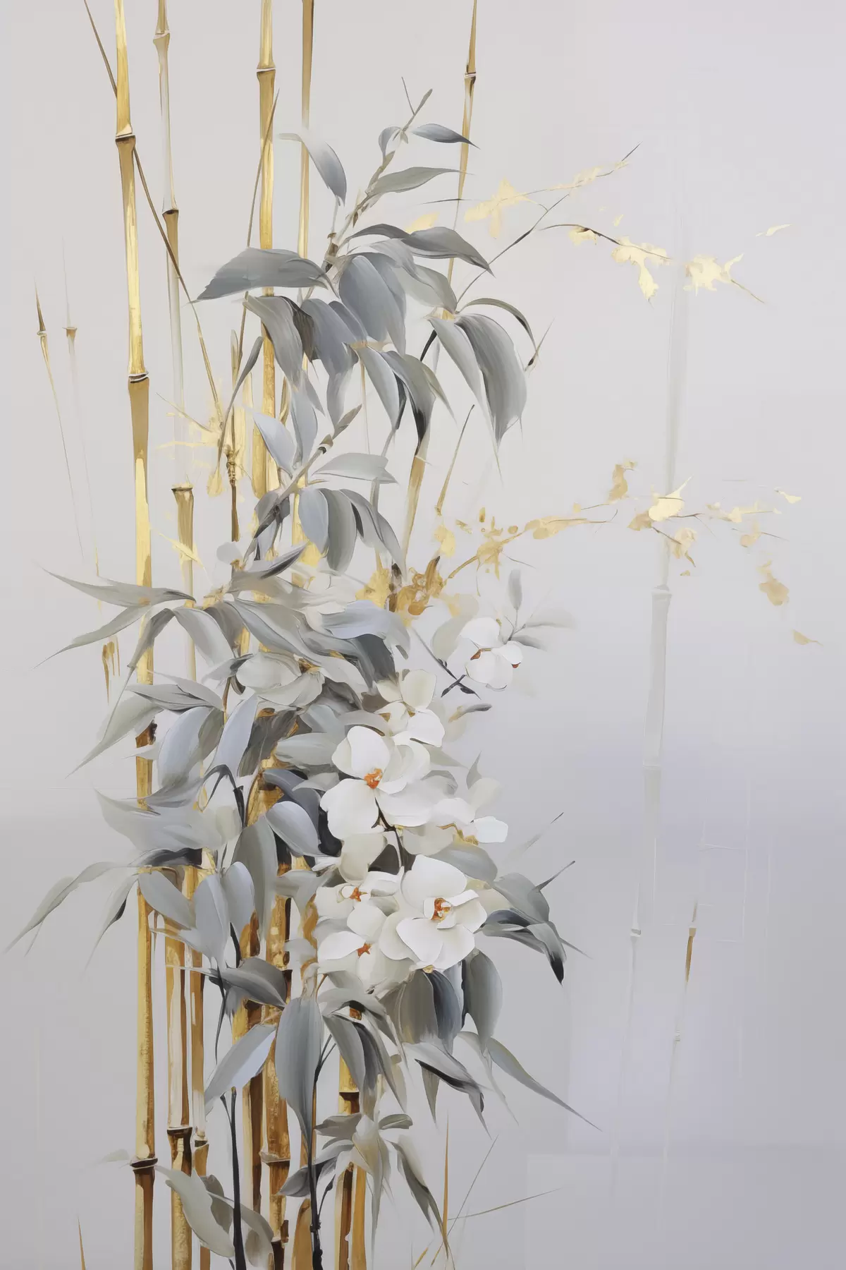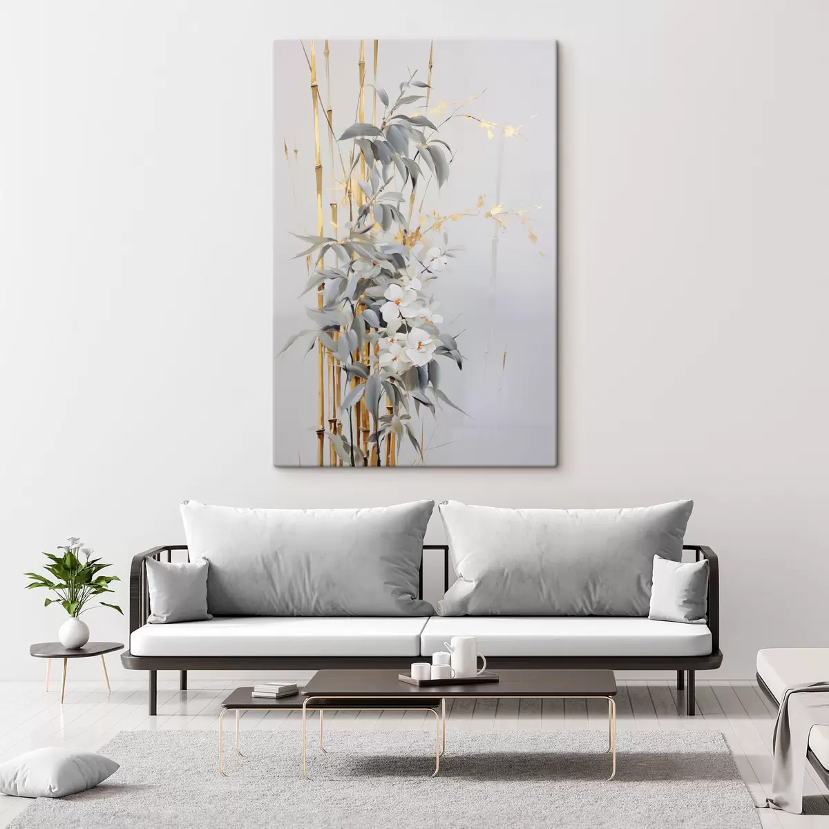 Obraz Abstrakcyjne łodygi bambusa z żółtymi akcentami, delikatnymi białymi kwiatami i jasnozielonymi liśćmi, szare tło Nr s47038