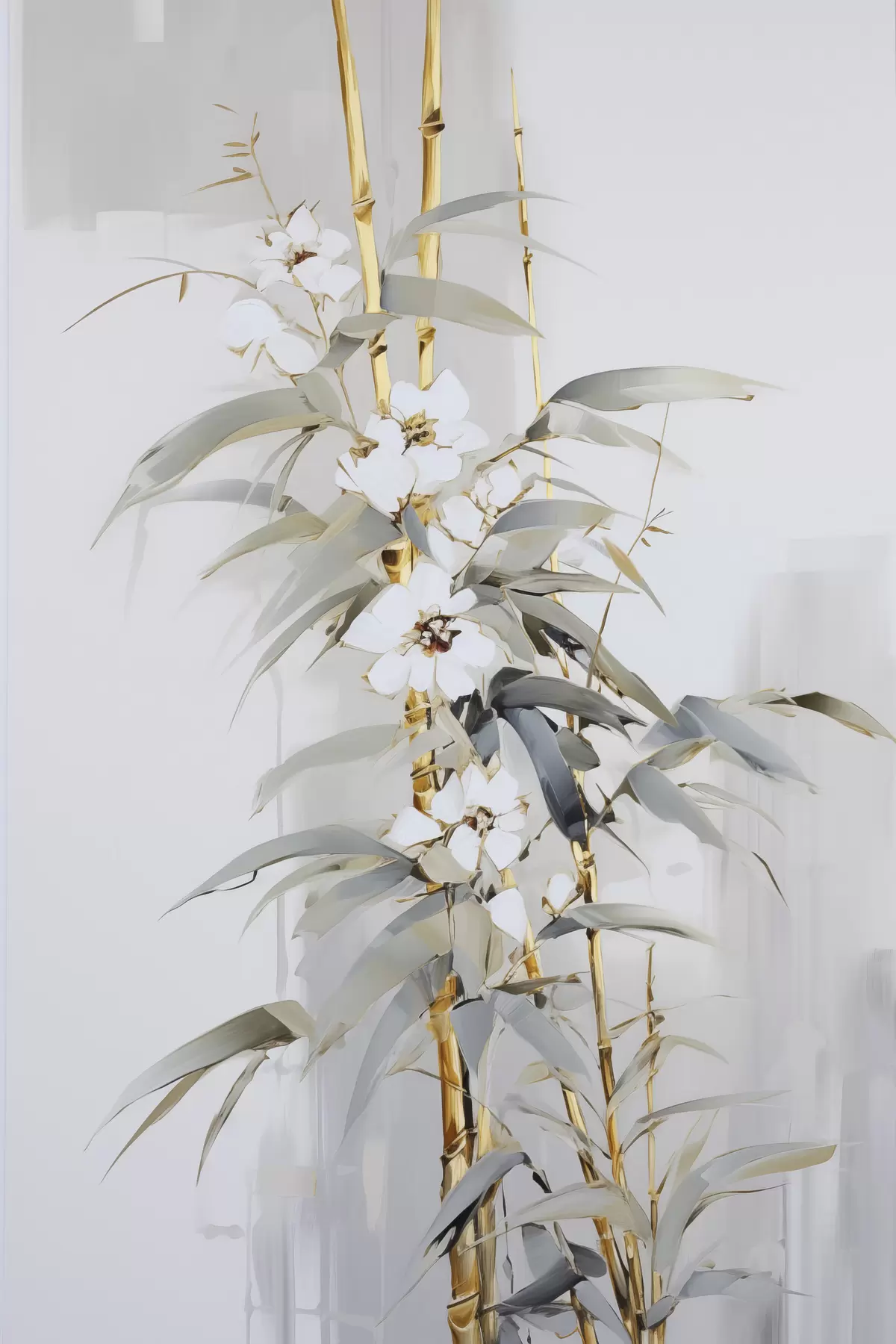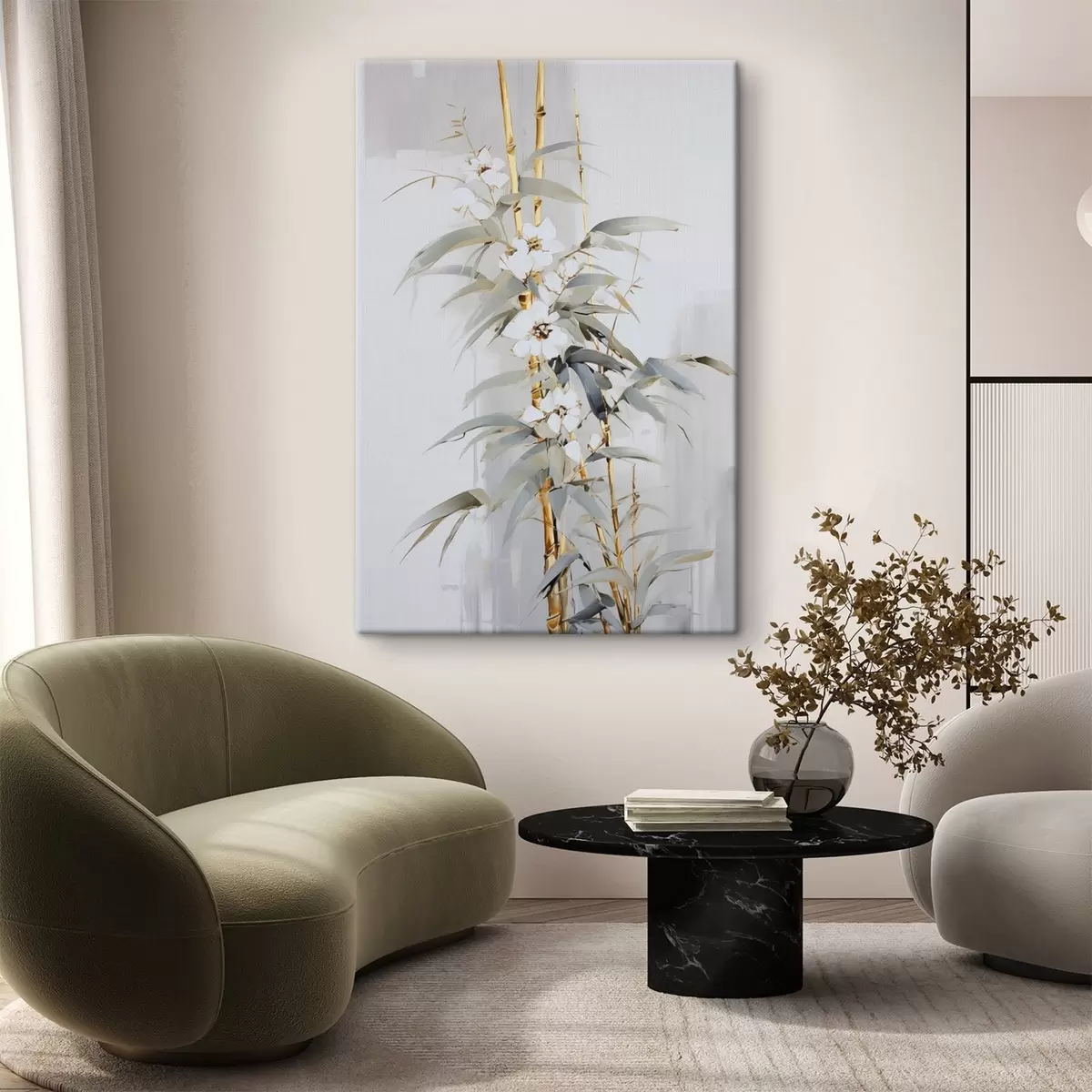 Obraz Abstrakcyjne łodygi bambusa z żółtymi akcentami, delikatnymi białymi kwiatami i jasnozielonymi liśćmi, szare tło s47039